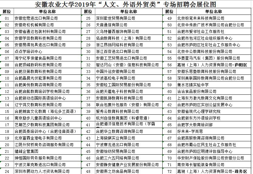 2019年3月24日“人文、外语外贸类”专场招聘会企业名单 日期:2019年03月22日 00:00 作者: 点击: 招聘会时间: 2019年3月24日(周日) 上午 9:00-12:00 招聘会地点: 安徽农业大学大学生活动中心四楼 上一条:【招聘】芜湖市协护税工作人员招聘 下一条:【招聘】宣城日报社招聘