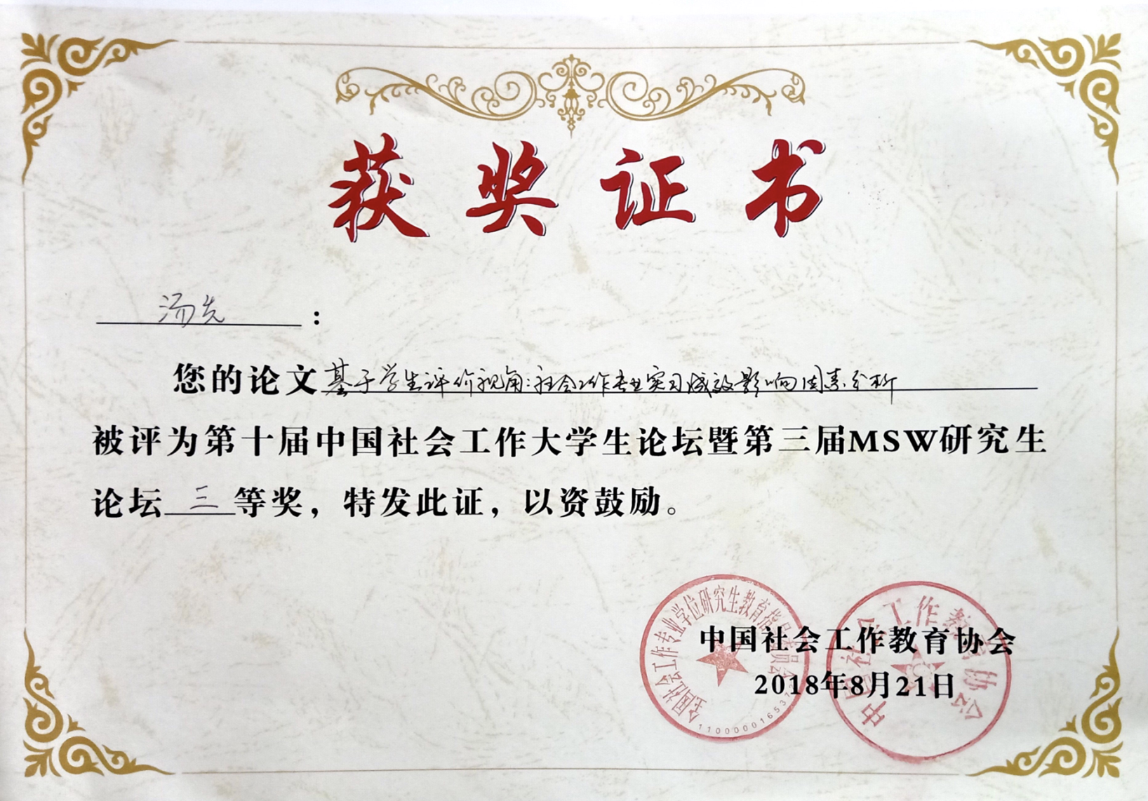 人文社科学院15级社会工作汤先同学的题为《基于学生评价视角:社会工作专业实习成效影响因素分析—以安徽A高校社会工作专业实习学生为调查对象》通过投稿、初审等环节获得本届论坛的入场券,在本科生分论坛演讲发言环节中,其论文质量和发言水平得到专家组的认可,最终荣获三等奖。