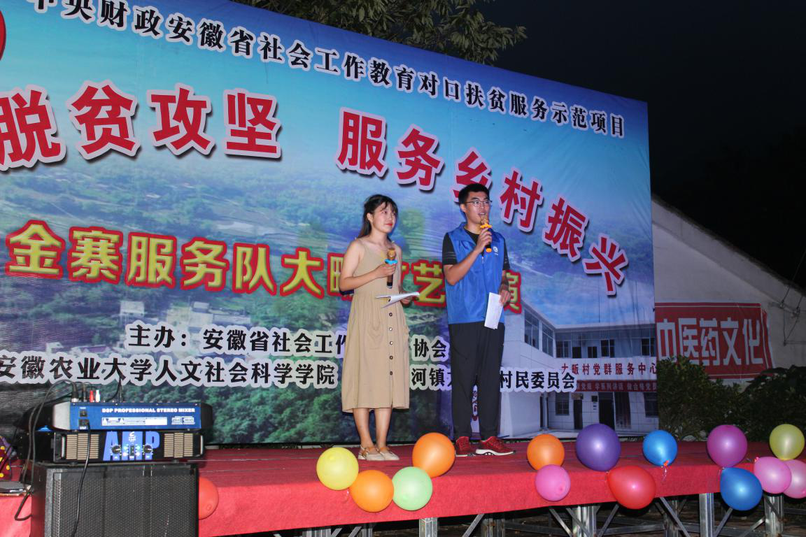 8月21日晚7点,一场以“助力脱贫攻坚 服务乡村振兴”为主题的乡村文艺汇演在金寨县双河镇大畈村村民舞台如期举行。本次文艺汇演是中央财政安徽省社会工作教育对口扶贫服务示范项目(金寨项目点)的服务内容之一,具体由安徽农业大学社会工作专业师生策划举办,并得到大畈村村两委及安徽农业大学驻大畈村工作的王润等三位教师的大力支持。