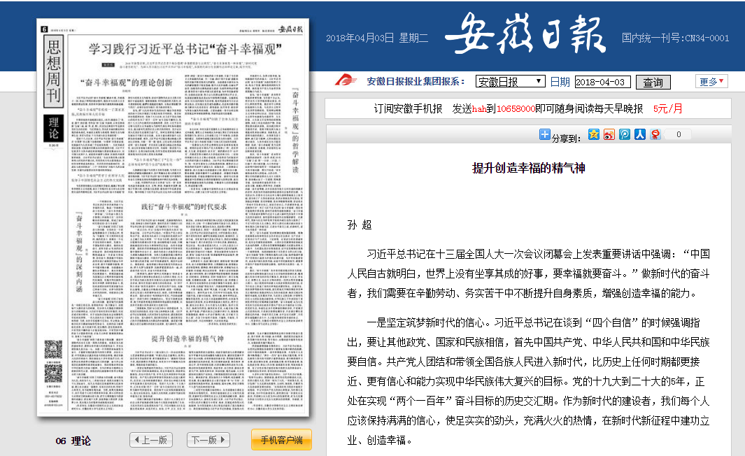《安徽日报》刊发我院孙超教授理论文章:提升创造幸福的精气神