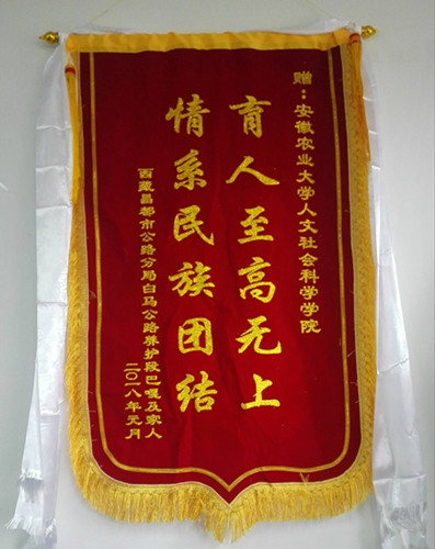 次旦多吉父亲拿出一面写着“育人至高无上 情系民族团结”的锦旗,献给学校表示感谢,并给在场的老师献上了洁白的哈达,以藏族的传统方式表达对学校的感激之情。