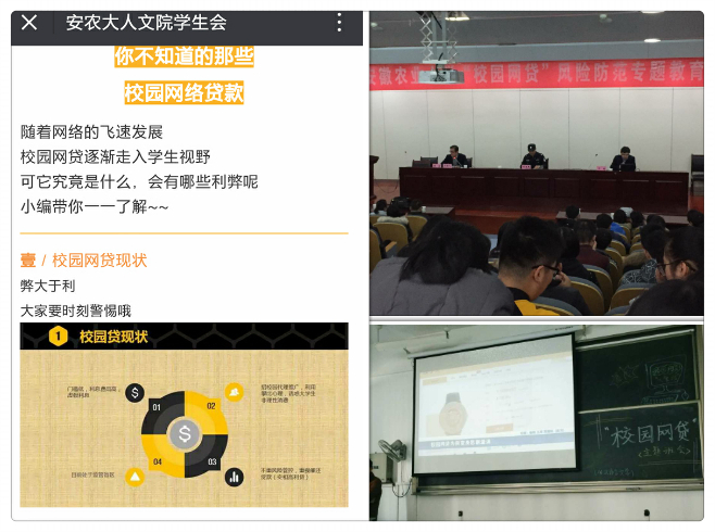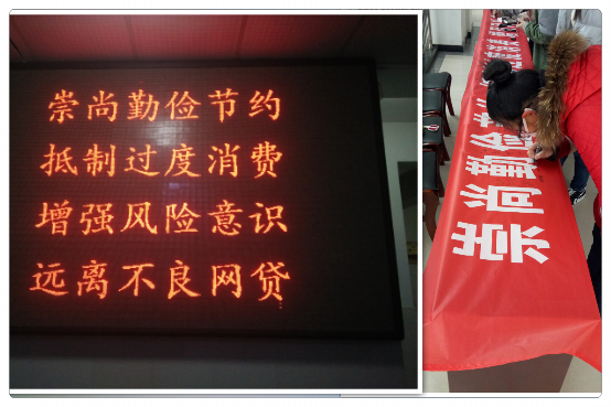 此外,我院学生认真聆听学校组织的相关主题教育课,在专题课中把握“校园网贷”与日常生活的关系,在宣讲嘉宾的指导下,树立符合自身实际的健康消费观。更利用微信、qq等线上媒体和院内电子屏多平台宣传,强化教育,引导同学们形成健康的消费心理,远离网贷,形成勤俭节约的良好风尚。