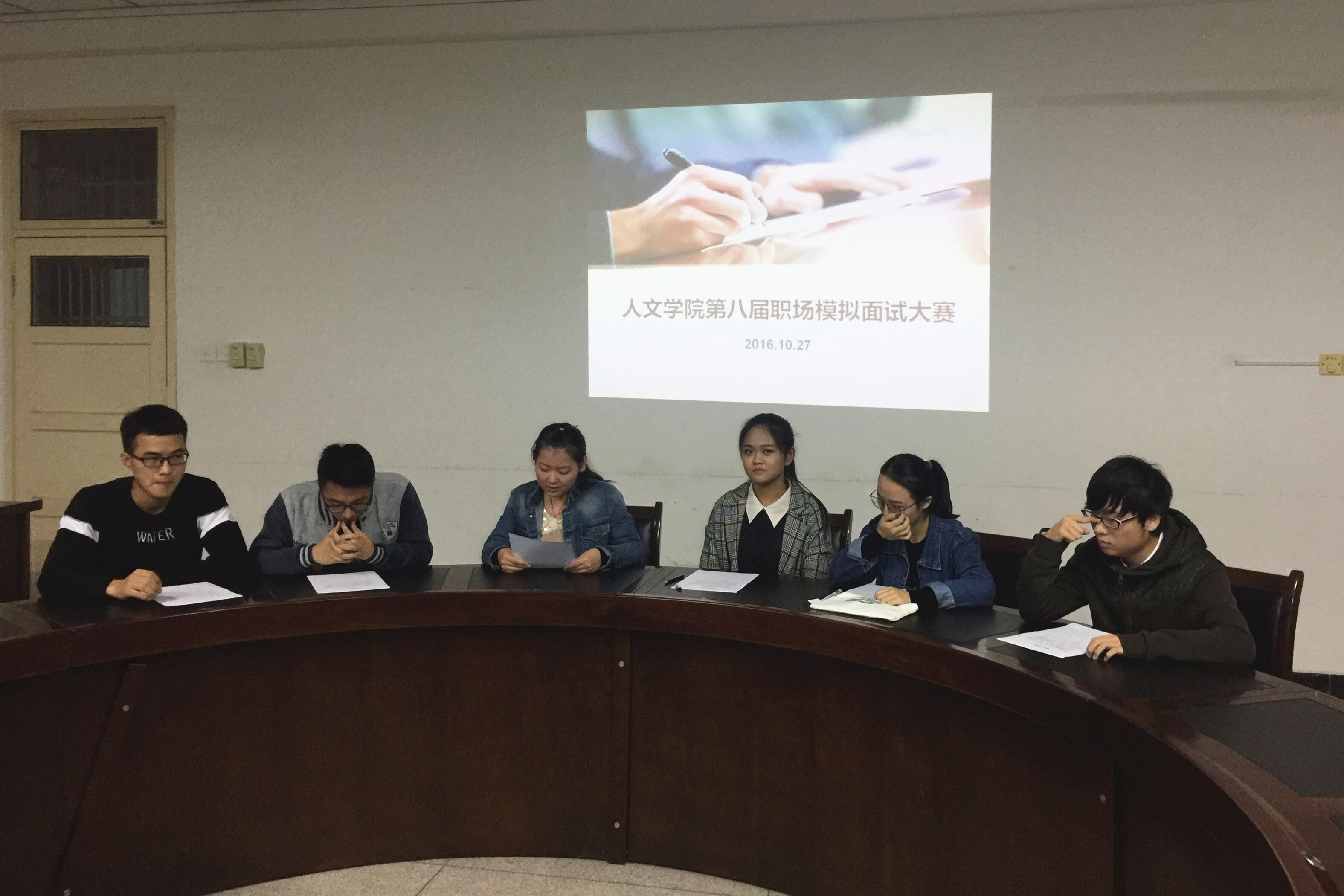 10月28日晚,学院第八届职场模拟面试大赛在人文楼204会议室举行,院团委老师担任评委。