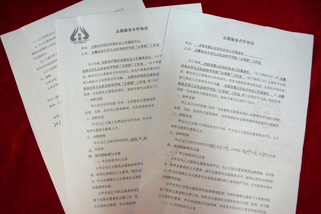 本网讯 为加强“正青春”工作室志愿者平台建设,引导青年大学生践行奉献、友爱、互助、进步的志愿者精神,服务于我校 “双创”型人才的培养方略,近日,“正青春”工作室分别与合肥市蜀山区民生社会工作服务社、合肥市庐阳区安泰社会工作服务中心签署志愿服务合作协议,致力于共同组建一支高素质、常态化的志愿服务团队。