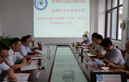 上午,在安徽财经大学思政部,该校思政部主任汪先平教授就该校思政理论课教学组织、教学效果、学科建设、课时设置、班级安排、考试改革、实践教学等方面进行了详细的介绍,双方还就思政部制度建设、人才培养方面等内容进行了深入地交流。下午,在安徽科技学院思政部,该校思政部主任王有炜教授专门介绍了该校思政理论课“移动课堂”教学的基本做法、成效和经验,双方还就思政理论课考试改革、“形势与政策”课教学等内容进行交流。其间,安徽科技学院党委书记蒋德勤教授来到会场,他强调,思政理论课是大学生成长成才过程中非常重要的课程,加强思政理论课建设、加强校际思政理论课教师的交流非常必要,他希望今后双方经常交流,取长补短,共同推动两校思政理论课的建设和发展。