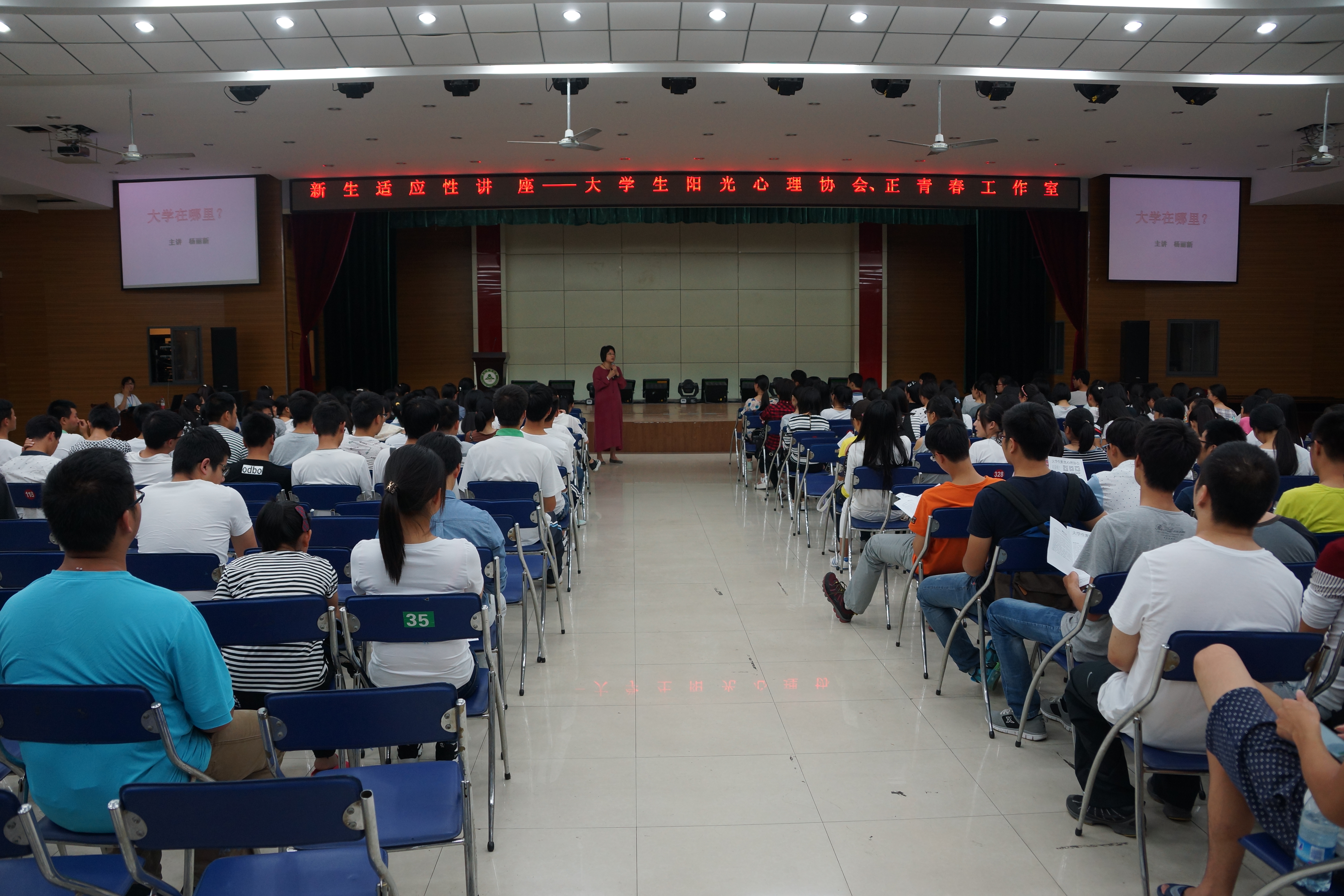 本网讯 9月28日晚,学院外聘教师、国家二级心理咨询师杨丽新老师应邀为院2015级学生做了一场“大学在哪里?”的主题心理讲座,讲座在大学生活动中心举行,由大学生阳光心理协会主办,正青春工作室承办。