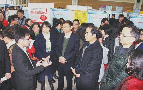 本网讯 3月15日上午,经济管理学院、人文社会科学学院、外国语学院联合举办了2015年经管、人文、外语、外贸类毕业生专场招聘会,来自省内外80余家用人单位受邀参会。校党委常委、副校长熊健、校党委副书记李恩年亲临现场指导工作,看望慰问招聘企业和应聘毕业生。校招生就业处负责同志、三学院党政领导也到场指导工作,详细了解各自学院毕业生应聘意向、求职需求,并就学校、学院在教学实践、人才培养、就业合作等方面与用人单位探讨交流。