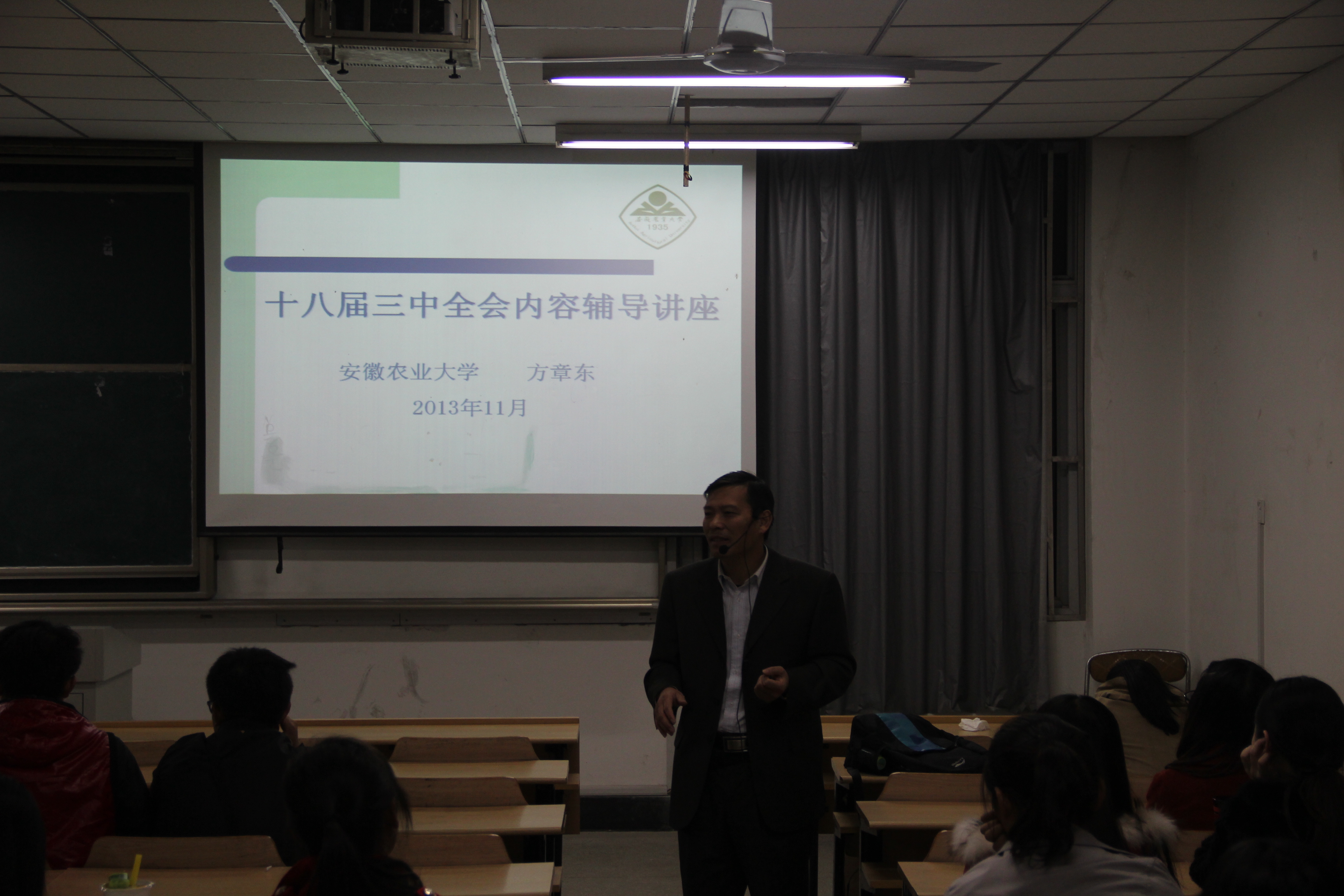 本网讯 为期四天的十八届三中全会于11月12日在北京胜利闭幕,为深入学习贯彻“十八届三中全会”精神,提高新生团干部的思想政治素质,11月18日晚上在人文楼202教室,思政部主任、副院长方章东教授为新生团干部做了一场解读十八届三中全会的讲座,2013级各班级团干部参加了讲座。