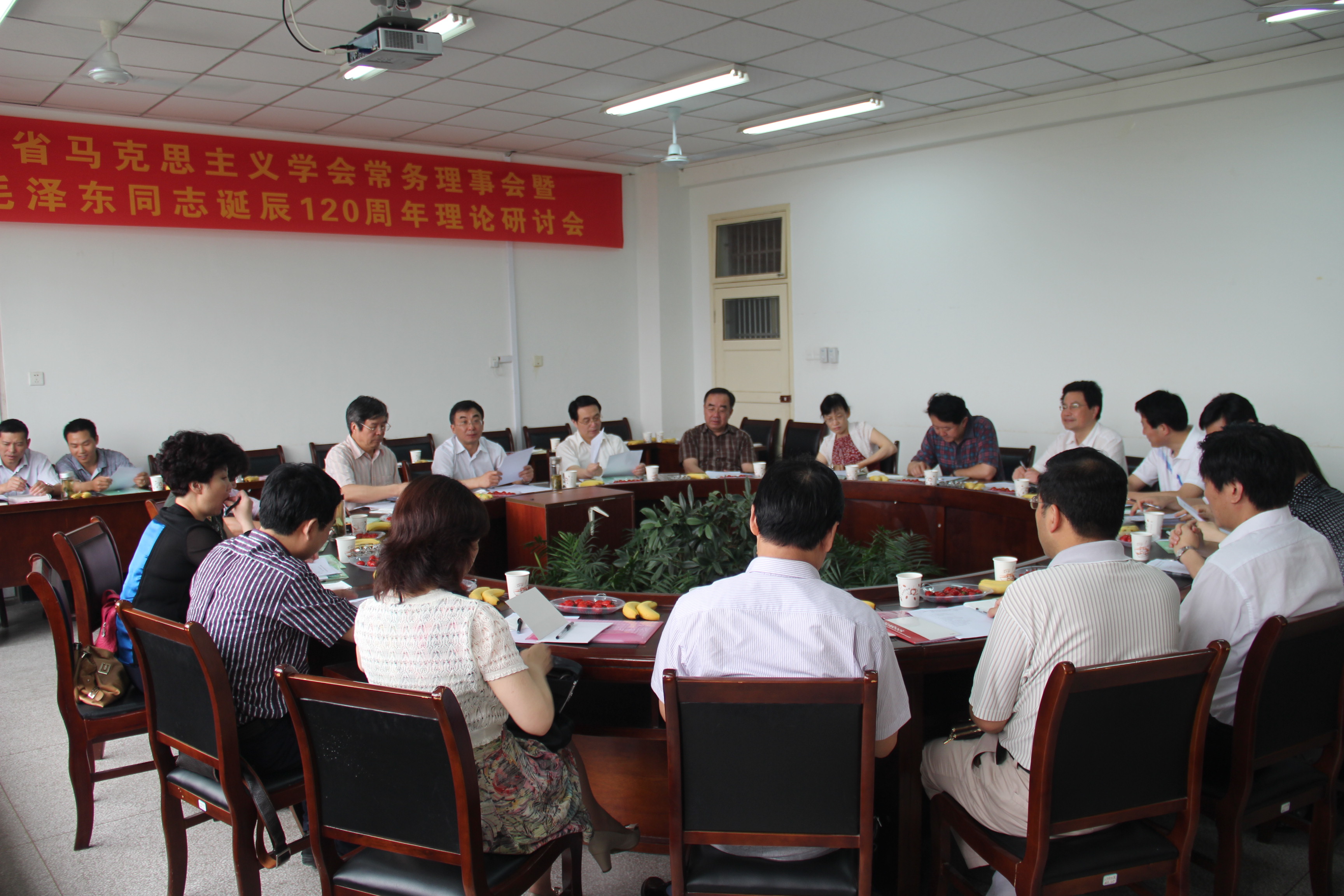 本网讯 5月25日,由人文社会科学学院承办的安徽省马克思主义学会常务理事会暨纪念毛泽东同志诞辰120周年理论研讨会在人文楼204室举行。安徽省15所高校、省社科院等30位专家、教授应邀参加了会议,校党委宣传部副部长黄洪雷、人文社科学院院长孙超、副院长方章东等参加了会议。会议由安徽省马克思主义学会会长王先俊主持。