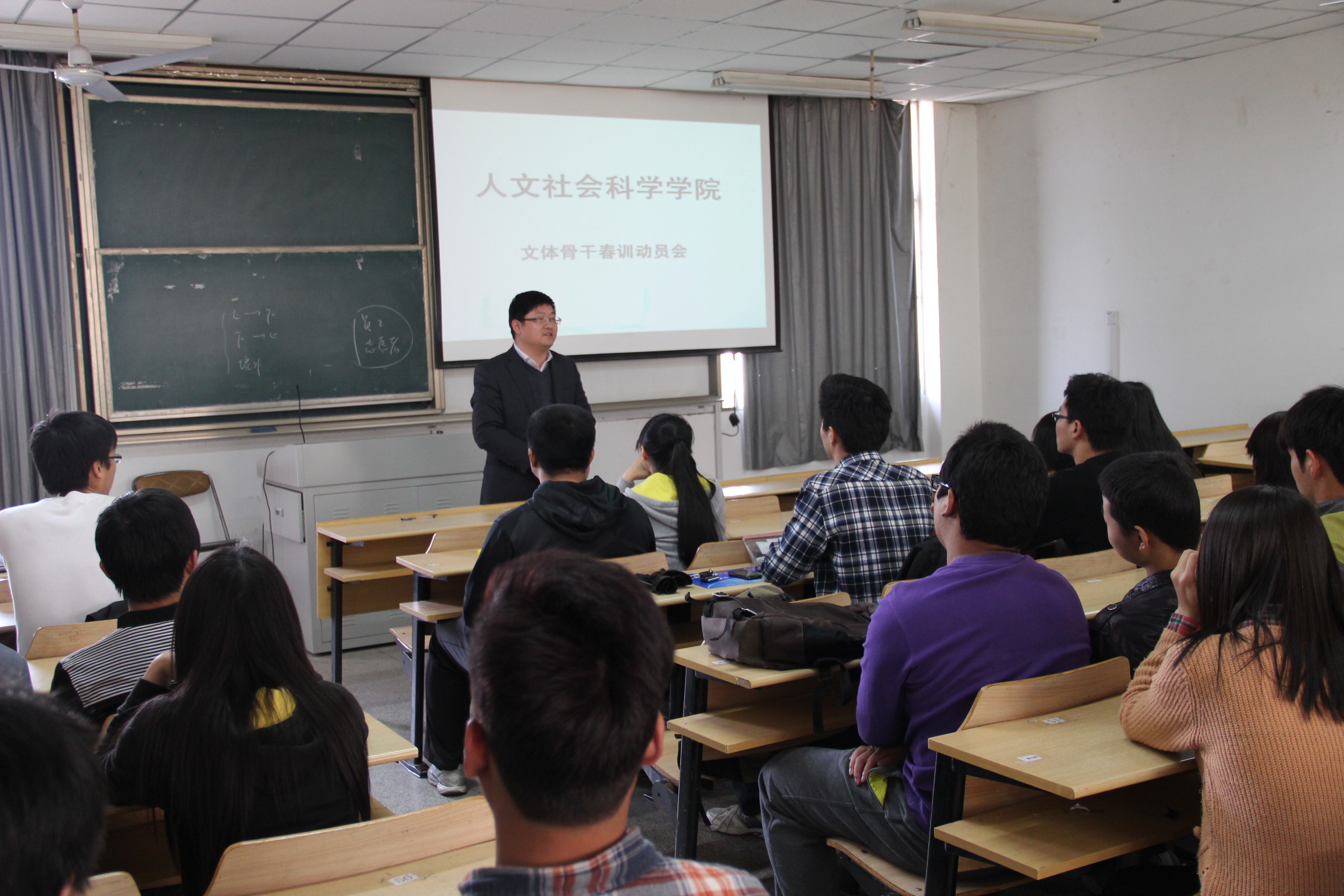 本网讯 4月8日,学院文体骨干春训动员会在人文楼202室召开。院党委副书记韩弥明、院团委负责老师、院舞蹈、健美操及田径队队员参加了动员会。
