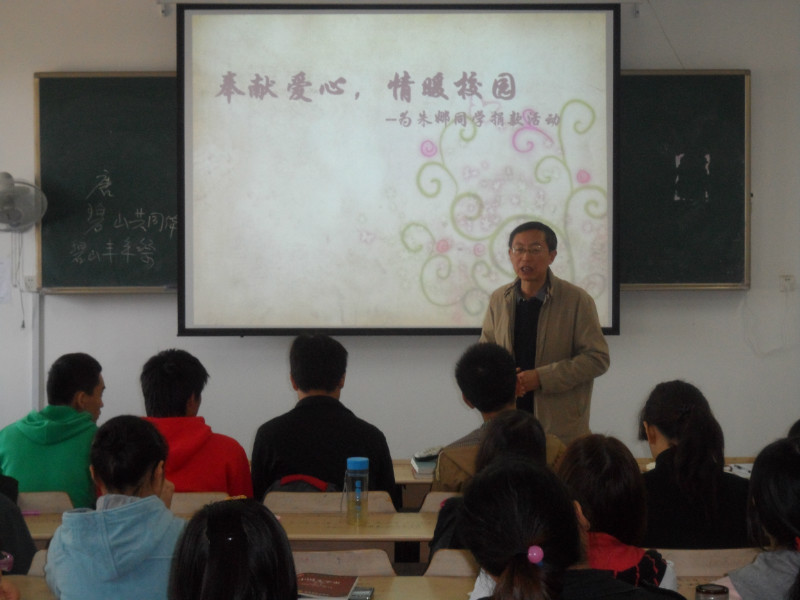 本网讯 10月31日上午,2010级汉语言文学专业在人文楼604室为朱娜同学举行了募捐活动。辅导员管志权老师主持了此次募捐活动。