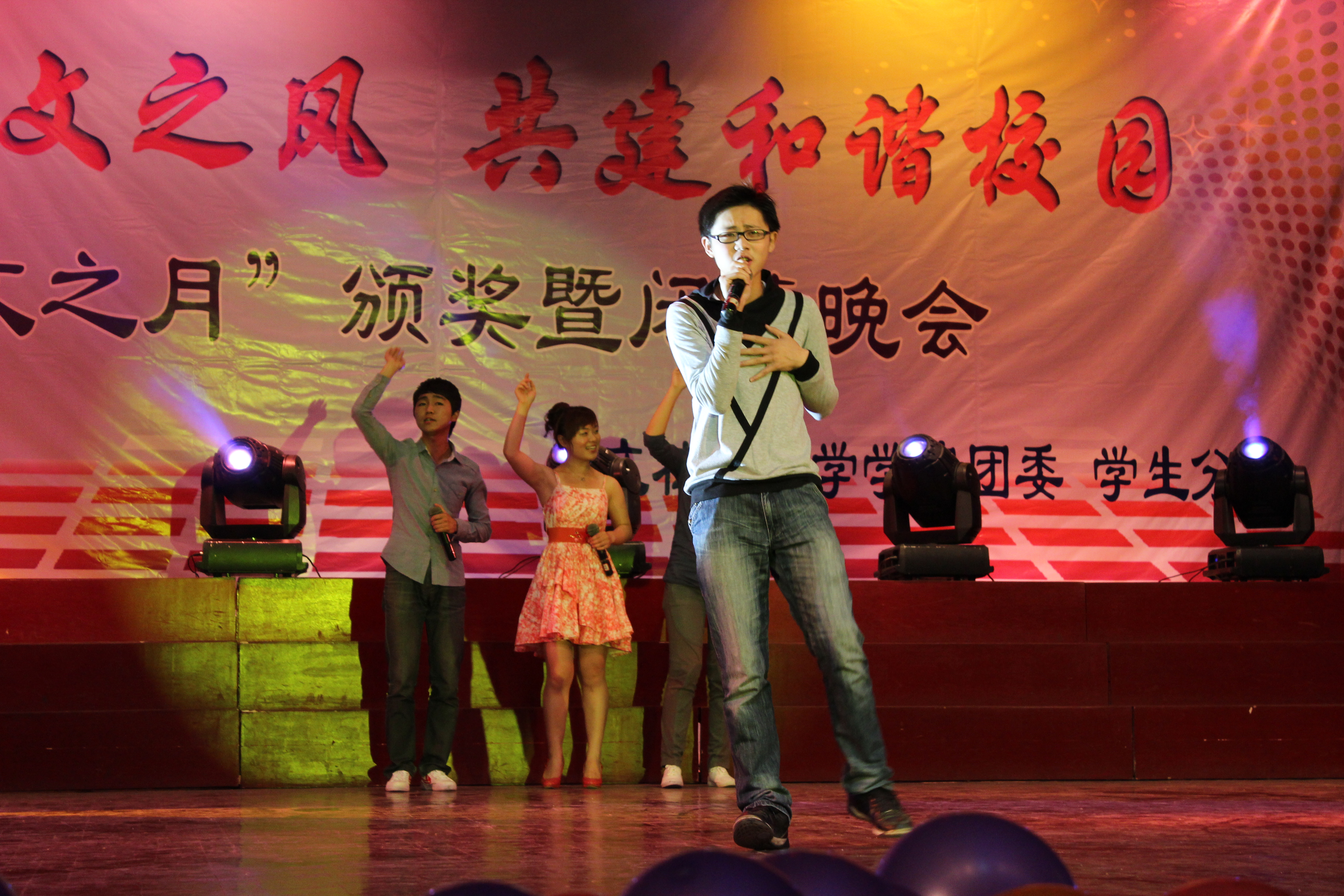 本网讯 5月16日晚,我院第十一届“人文之月”颁奖暨闭幕晚会在大学生活动中心(大礼堂)隆重举行。校党委宣传部、学生处、招生就业处、国际交流中心等单位负责同志应邀观看晚会,学院党政领导、系(部)主任、辅导员老师和广大师生济济一堂,观看了晚会。