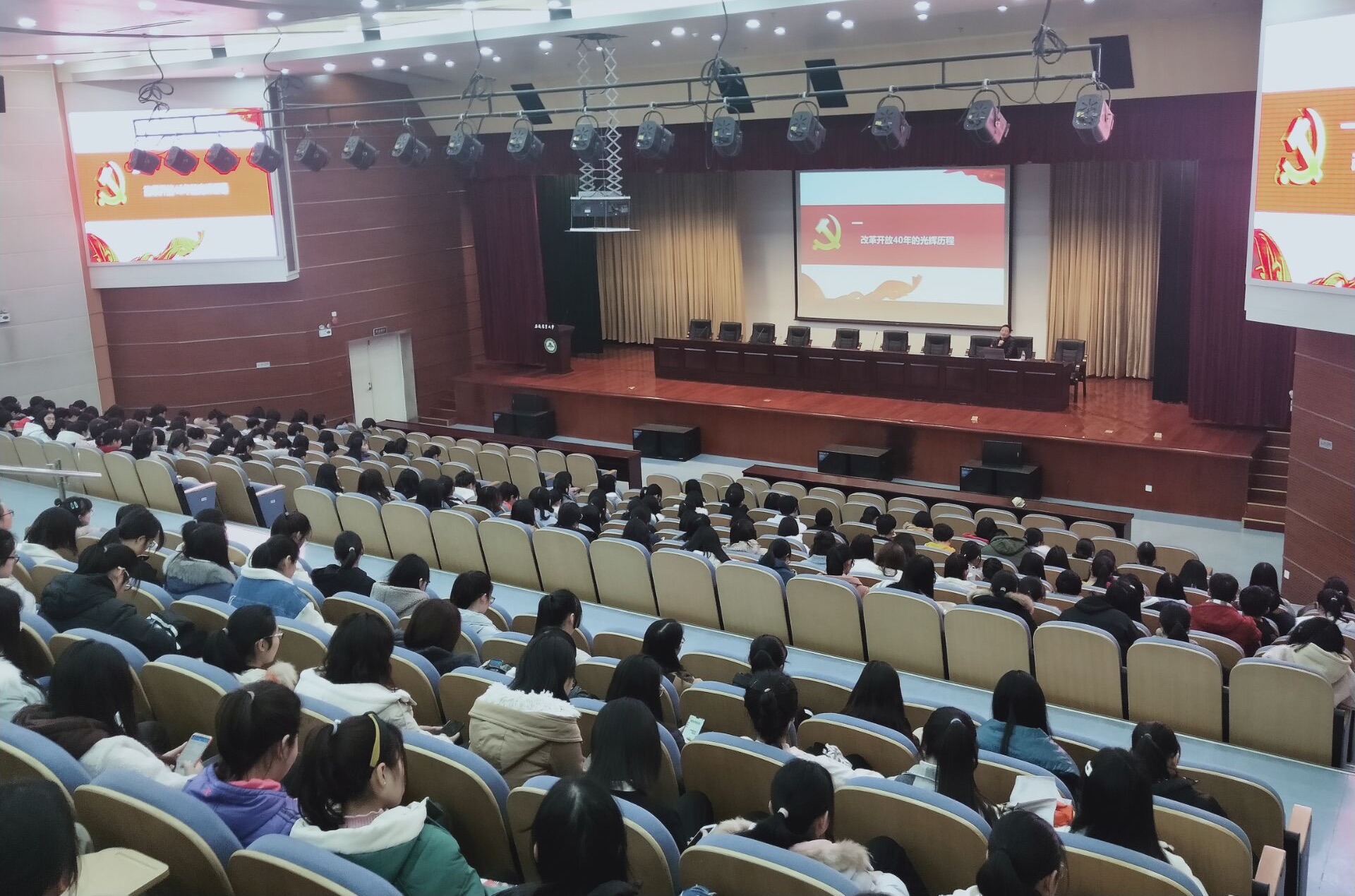 3月5日晚,人文社会科学学院在校图书馆第一学术报告厅,开展系列党课第一课,由学院党委书记孙超教授讲授——庆祝改革开放40周年,从改革开放宝贵经验中汲取力量”专题宣讲,这也是安徽省委讲师团开展的“举旗帜,送理论”活动,人文学院2018级全体学生参加了此次党课教育活动。