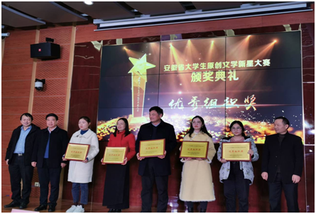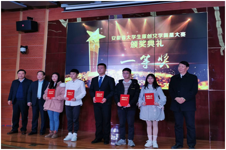 本网讯 12月29日下午,“江淮杯”安徽省大学生原创文学新星大赛颁奖典礼在安徽大学文典阁报告厅圆满落幕,学院获奖同学在中文系专业教师刘玉梅带领下参加了颁奖典礼。本次“江淮杯”安徽省大学生原创文学新星大赛,学院斩获一等奖2项(一等奖共6项),二等奖、三等奖各1项,优秀作品奖若干;方国武、王婉婉获得优秀指导教师称号;学校荣获优秀组织奖。这次成绩是学院继去年“校园读书创作大赛”取得优异成绩之后的又一次突破。