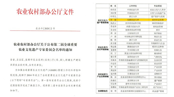学院孙超教授入选全球重要农业文化遗产专家委员会