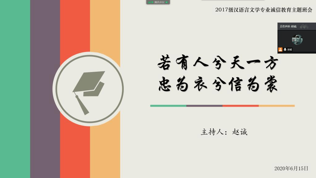 各班级开展形式多样的诚信教育主题班会。充分利用QQ群、腾讯会议等网络平台,通过知识宣讲、观看视频、知识竞答、学生分享等方式开展丰富多彩的主题班会活动,以此来提高学生的诚信意识。