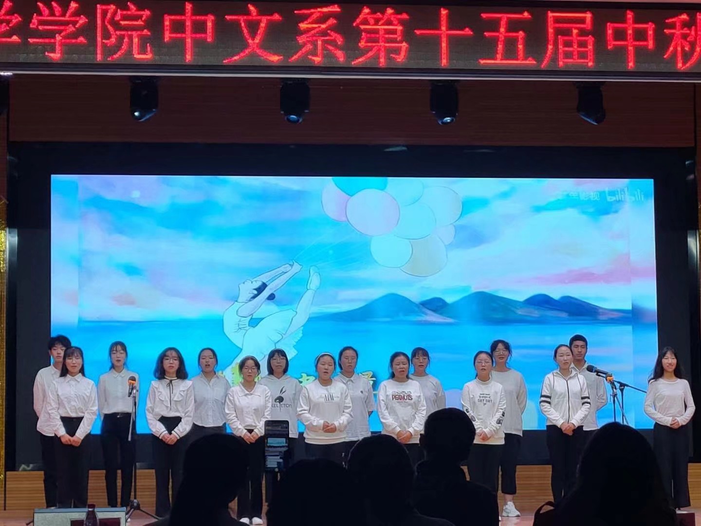 晚会内容丰富,以诗朗诵为主要形式,中间穿插舞蹈、合唱、相声、舞台剧等形式。朗诵《月明中秋》体现了安农人文人的厚实功底,20级新生们句句铿锵有力,精神迸发。最后晚会在大合唱《我们都是追梦人》歌声中落下帷幕。