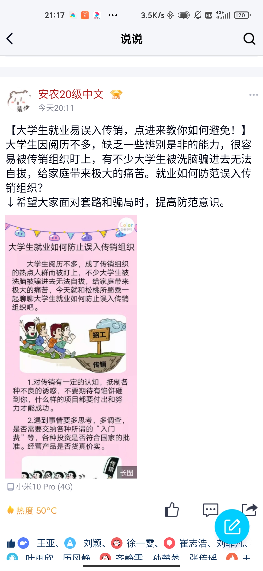 综合利用各种渠道,开展宣传教育工作。学院充分利用QQ群,各班级官方QQ,学院微信公众号人文之光等媒体,开展宣传教育活动,传达传销相关知识,提高学生的认识水平和防范意识,引导学生树立正确的金钱观和劳动观。