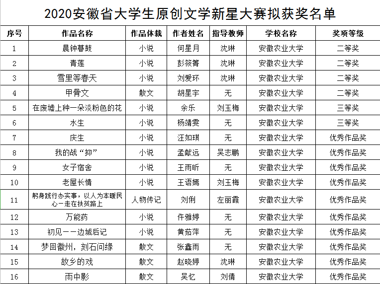 又讯 近日,2020年安徽省大学生原创文学新星大赛评选结果揭晓,学院参赛作品荣获二等奖4项,三等奖2项,优秀奖10项,较去年获奖作品数量增长一倍,取得参加此项赛事以来的最佳成绩。