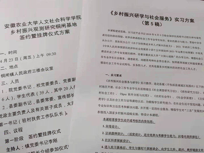 为保证实习质量,切实增强社会工作专业学生社会服务、调查研究、问题思考和社会责任意识,系主任叶良均老师带领实习指导组工作人员,多方联系实习点,并根据课程需求与地方条件,最终择定含山县铜闸镇,签订院地共建乡村振兴观测研究基地协议,构建本科生实习实践、专硕人才培养、科学研究等综合性人才培养基地。实地实习活动前,社会学系老师们反复酝酿实习方案;在乘车、住宿、饮食、村干部及实习地其他负责人的联络等各个环节详细安排,明确了实习内容;提前制作入户调查问卷、座谈访谈提纲等调查工具,设计和制作实习社区科普展板、宣传教育材料,做好风险分析和安全保障措施预案等。