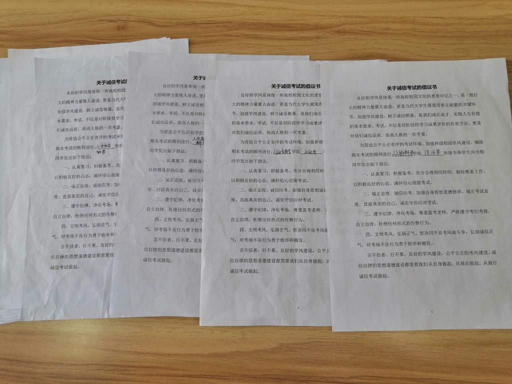 各班级开展“诚信应考,你我同行”主题教育班会,在班会上,各班级学习了诚信考试相关PPT、关于考试作弊的相关法律法规和校规校纪,并学习了考试作弊相关警示案例。各班级还签署了诚信考试倡议书。