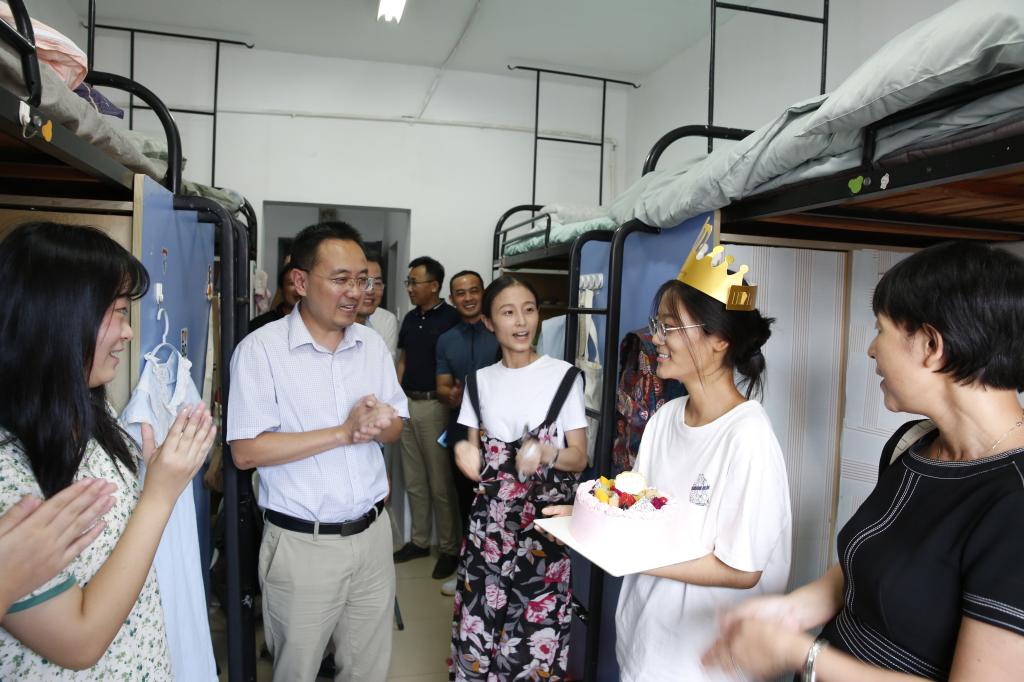 本网讯 9月9日,2021级人文社会科学学院本科新生报到的当天,恰逢2位新生生日,学院党政领导及新生辅导员一行带上校迎新工作组精心准备的生日蛋糕前往宿舍看望新生,送去诚挚的生日祝福,并与新生交流,勉励大家尽快适应大学生活、投入崭新的学习阶段。