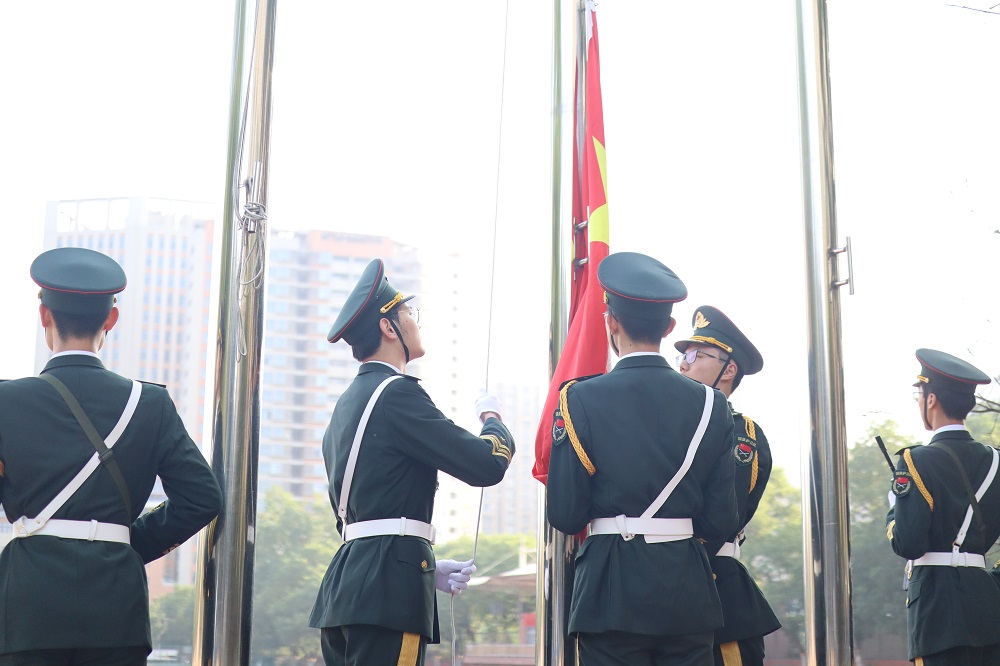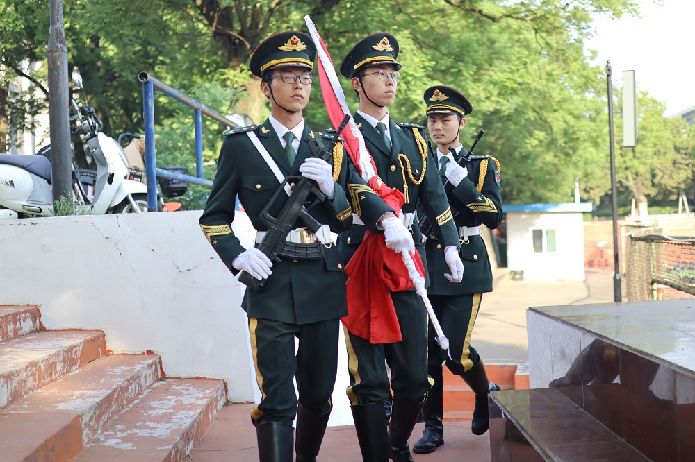 升旗仪式开始,国旗护卫队迈着铿锵的步伐,护卫着五星红旗来到升旗台,鲜艳的国旗迎着朝霞冉冉升起,全体师生行注目礼,怀着对祖国深沉的爱,齐声同唱中华人民共和国国歌。