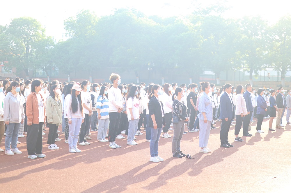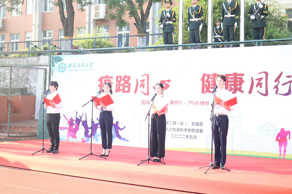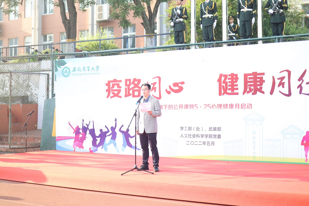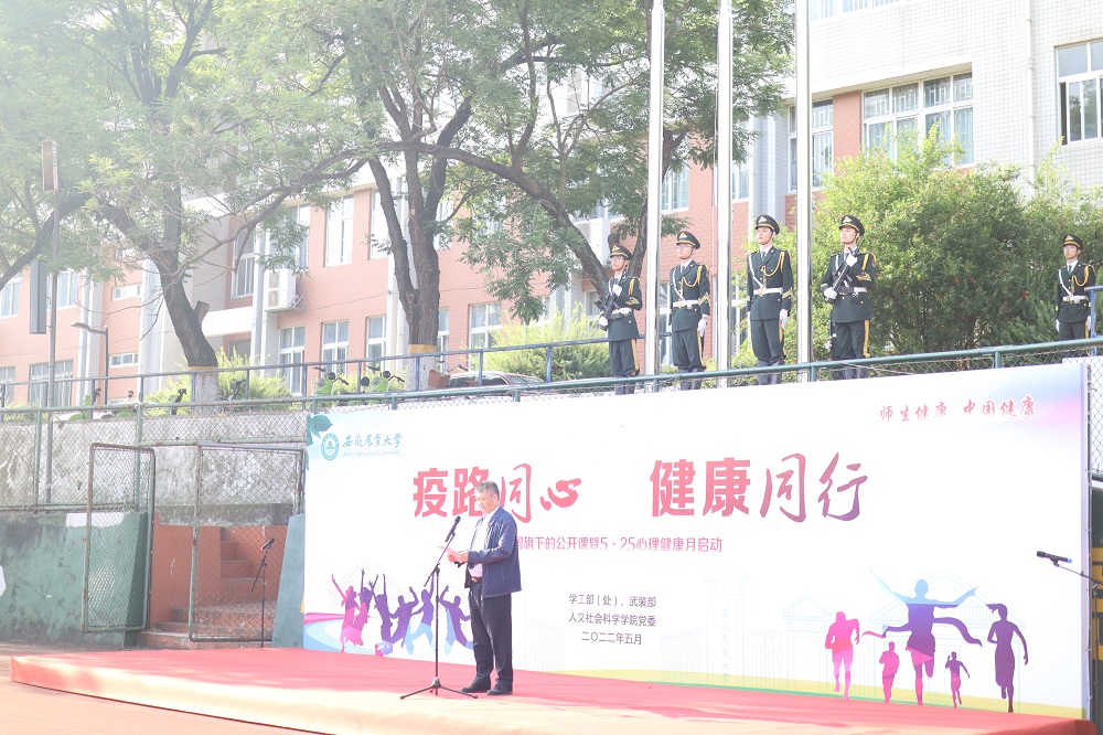本网讯 5月16日上午,人文社会科学学院在校第一运动场举行“疫路同心,健康同行”主题升旗仪式。校党委学工部(处)、武装部、学生处处长姚莉,副处长刘柳、周涛,学院党政领导、21级学生专职辅导员、学院2021级全体本科生、2019级与2020级应用心理学专业学生参加了本次升旗仪式。升旗仪式由院党委副书记吴永红主持。