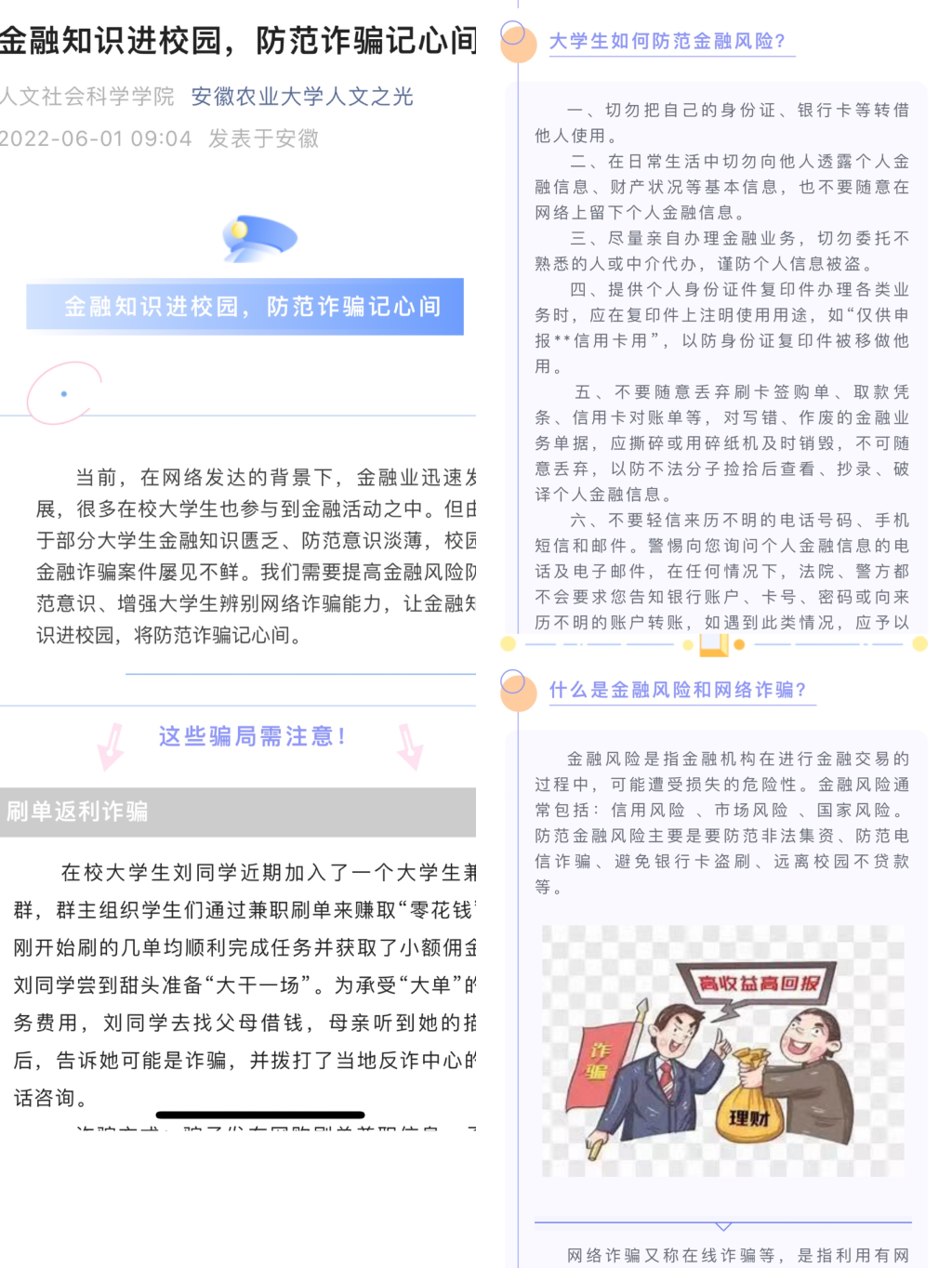 开展金融知识普及宣传教育。学院通过官方微信公众号平台,发挥网络育人功能,用正反两方面案例,引导学生理性消费,珍视个人信用记录,防范网络诈骗,远离不良“校园贷”“互联网消费贷”及其他非法借贷,帮助学生树立正确的消费观、荣辱观和价值观。
