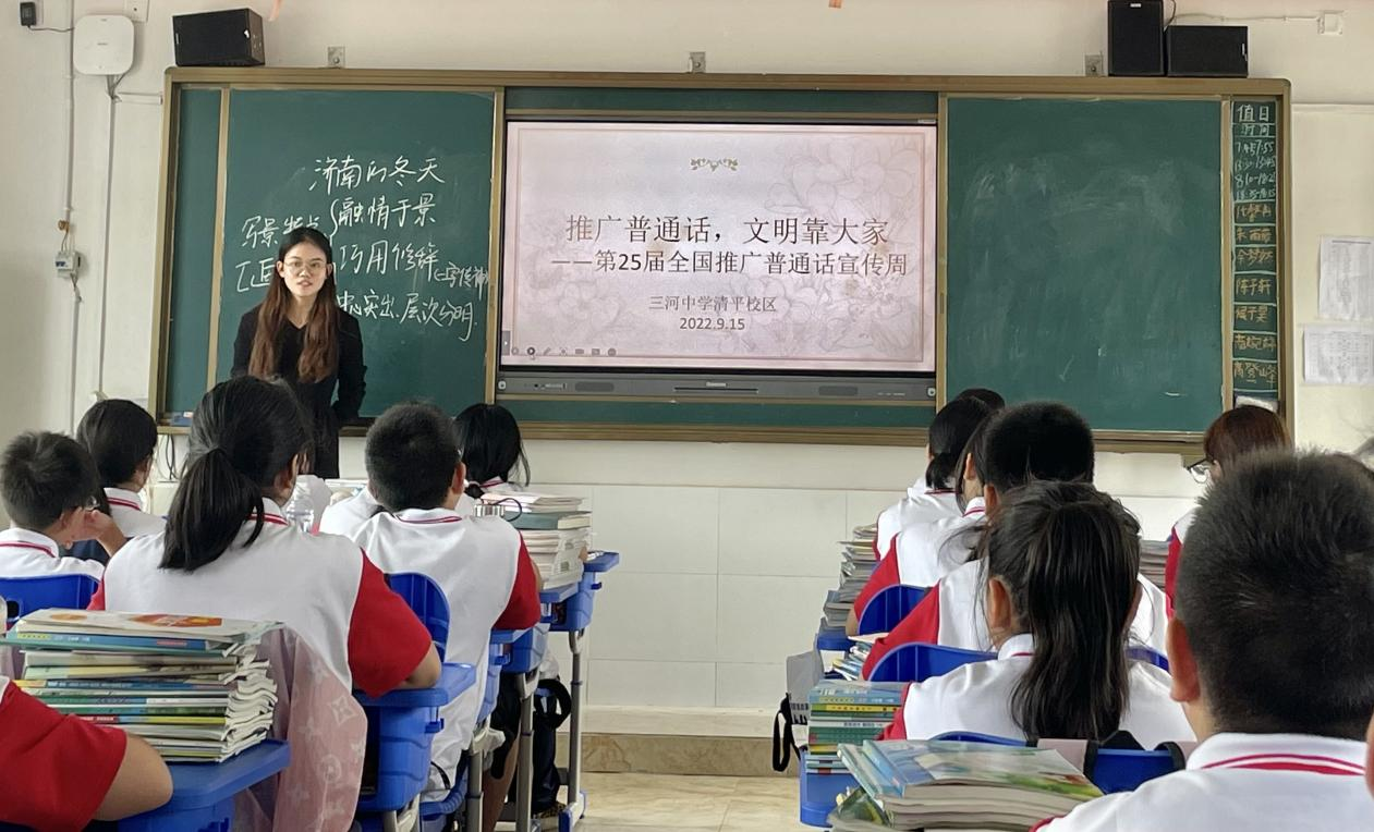 姜红院长代表人文社会科学学院向三河中学清平校区捐赠文具图书,并就推广普通话工作与师生们进行座谈交流。我院18级汉语言文学专业优秀毕业生、现三河中学清平校区语文教师武家惠,给七年级同学作了一场“推广普通话,文明靠大家”的主题讲座。