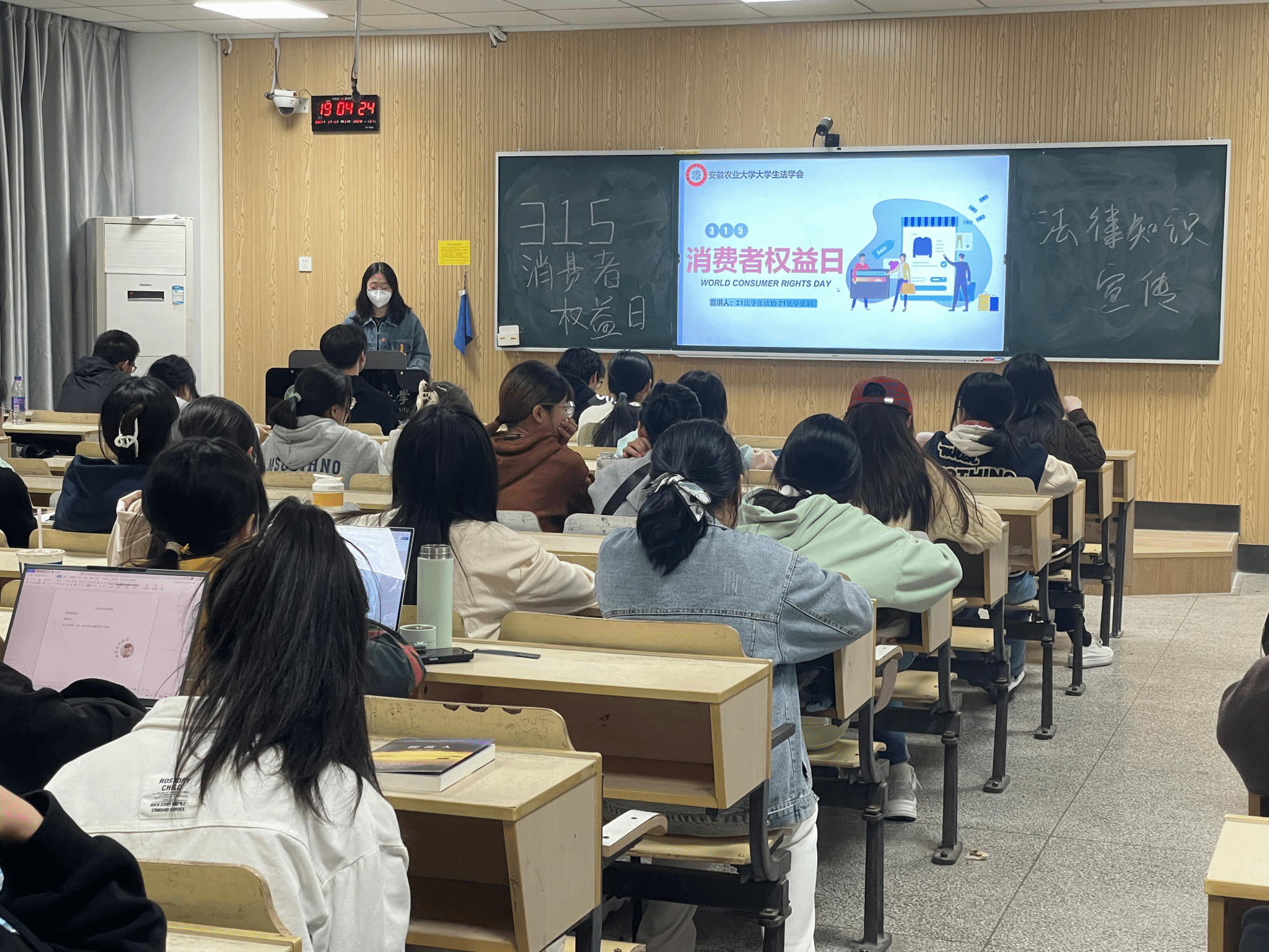 主题宣讲进班级,维权意识牢树立。开展“创优消费环境 提振消费信心”主题PPT宣讲活动,面向22级新生班级,充分利用晚自习时间段进行普法。本次宣讲活动主要阐述3·15消费者权益日由来、发展历程以及消费者权益保护本土化发展进程,着重介绍中国消费者协会宗旨职责、立法保障、维权途径三个部分,通过PPT案例展示、短视频播放等方式,结合当下消费维权热点话题与经典案例,提高同学们理性维权的意识和能力,引导学生树立正确的消费观来指导消费行为。