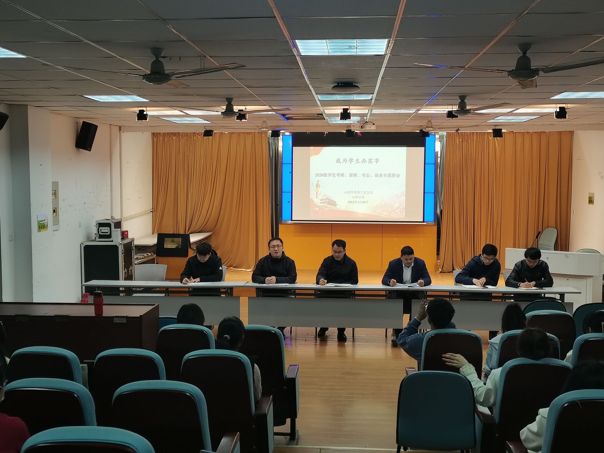 本网讯 为尽早促使学生提升就业意识,3月29日,学院召开2020级应用心理学专业本科生考研和就业指导主题班会。学院党委副书记吴永红,副院长滕瀚、单国雷出席班会。班会由心理学系主任刘燊主持。主题班会召开前,心理学系教工党支部结合主题党日活动,就考研、保研、考公、就业、心理健康等多方面在班级通过无记名的方式采集学生困惑和疑难,收集了五十余条学生问题。