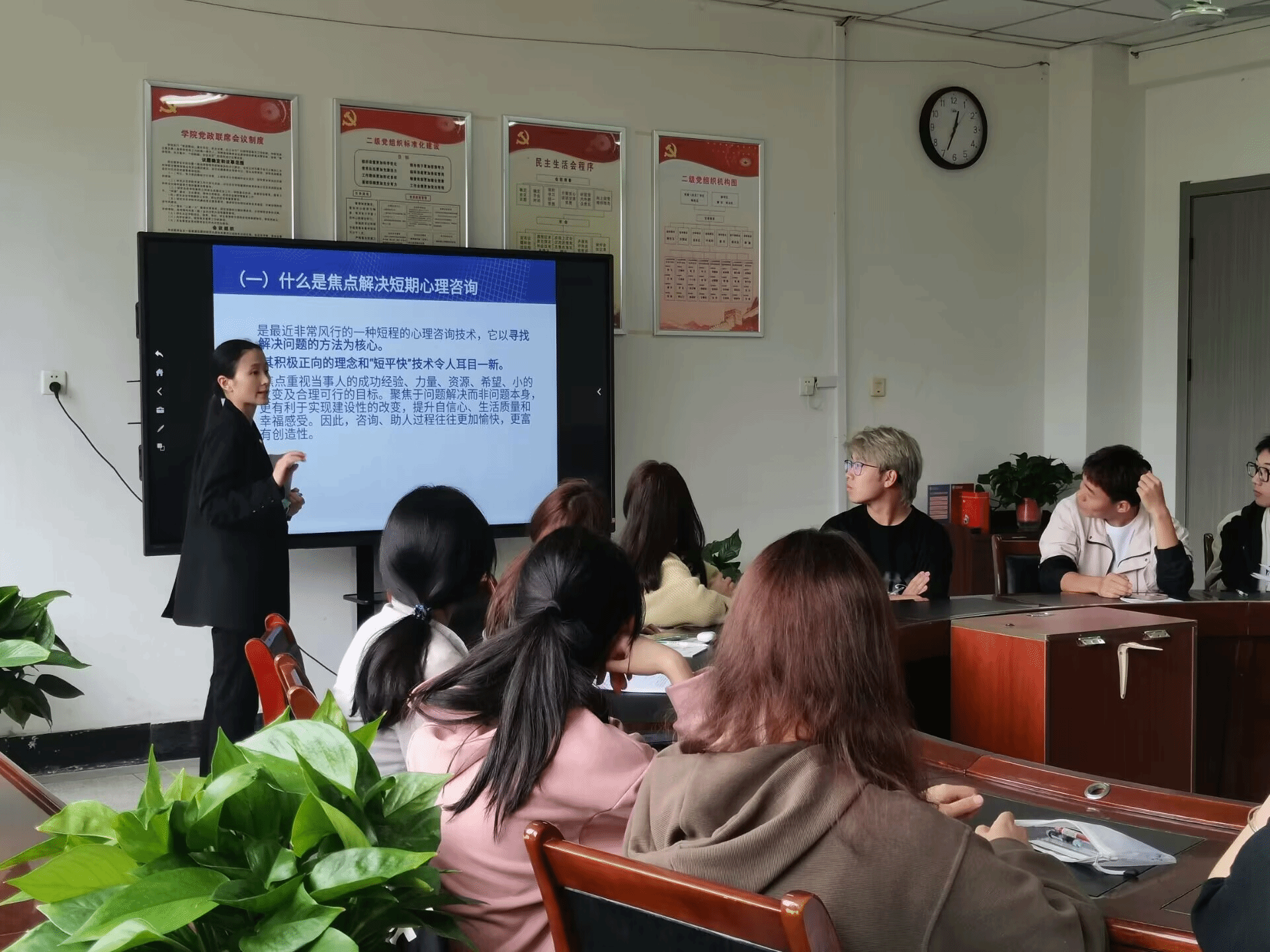 学院二级心理辅导站辅导员以“焦点解决短期心理咨询技术在学生工作中的运用”为主题展开培训,以寻找解决问题的方法为核心,强调聚焦于问题解决而非问题本身,要求大家重视大学生自身潜能与资源的开发运用,提升自信心、生活质量和幸福感受。培训中,大家还集中学习《大学生心理健康教育》课程实施方案,要求各班级心理委员要督促同学按时按质完成心理健康教育课程。
