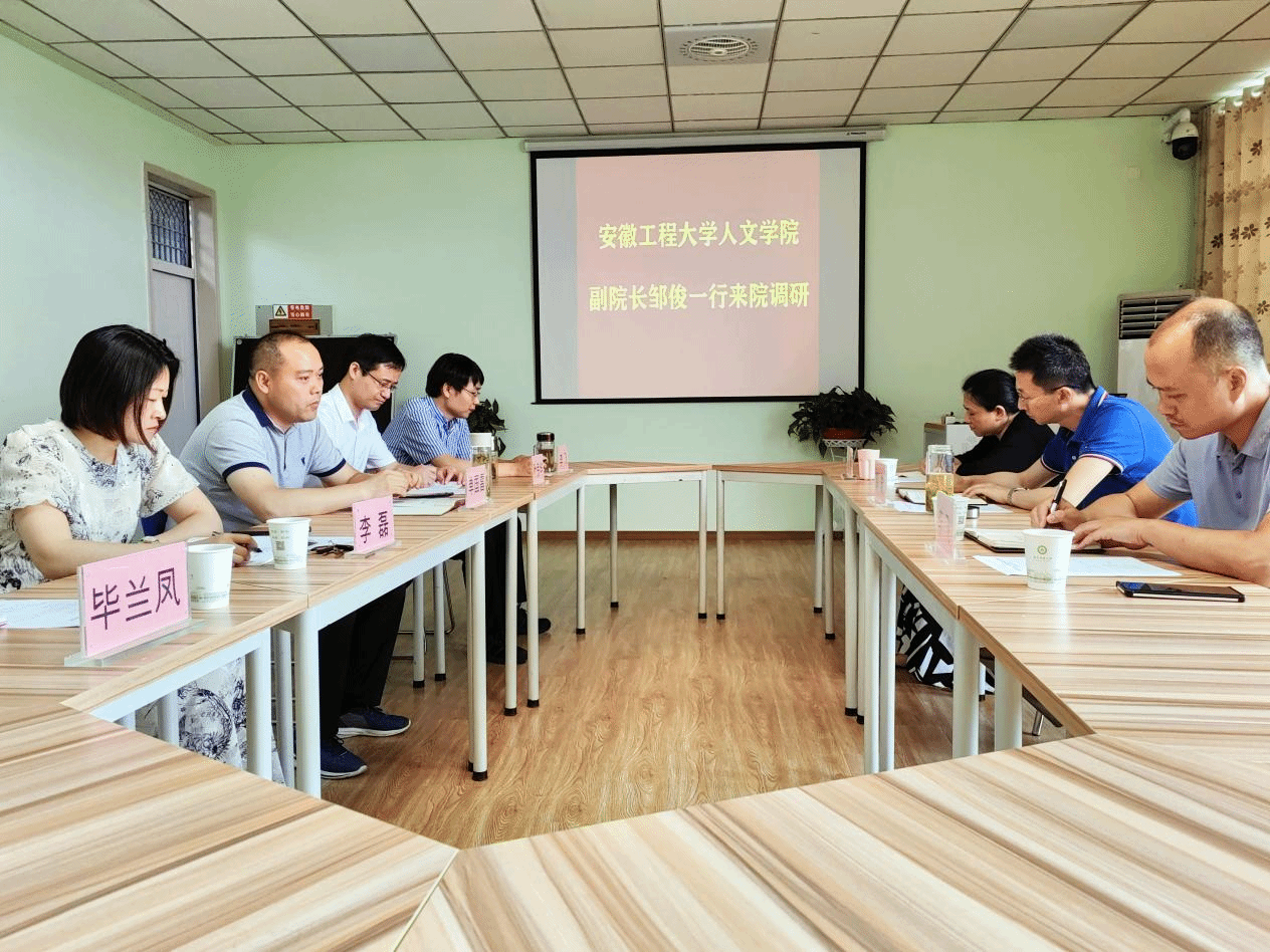 本网讯 6月15日下午,安徽工程大学人文学院副院长邹俊一行3人就社会工作专业建设来我院调研。院党委书记陈先玉热情接待了邹俊一行,副院长单国雷、社会工作专业硕士点负责人叶良均等参加座谈会。
