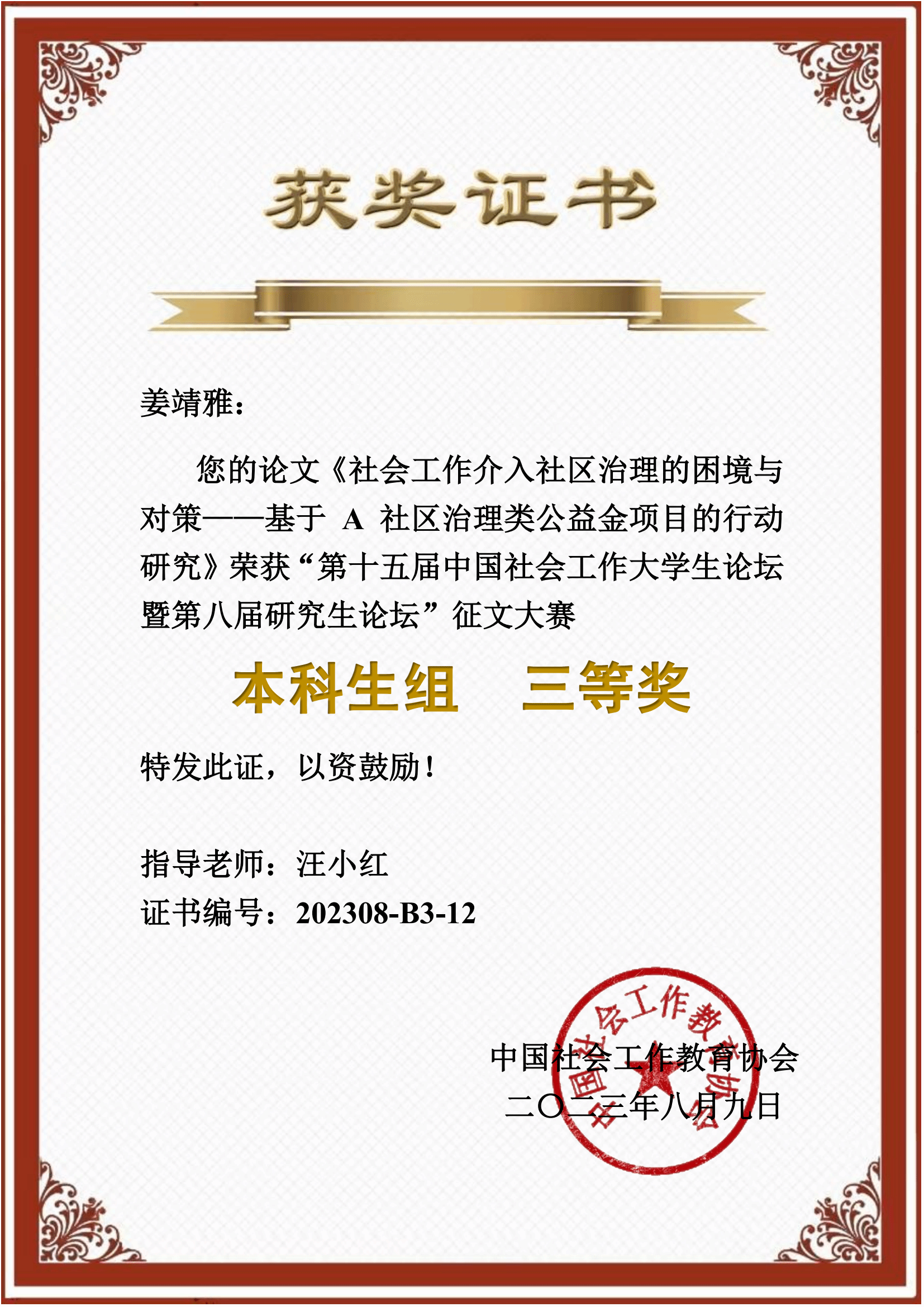 本网讯 近日,由中国社会工作教育协会主办、内蒙古工业大学人文学院承办的“第十五届中国社会工作大学生论坛暨第八届研究生论坛”在内蒙古工业大学隆重举行。我院2020级社会工作专业姜靖雅同学的论文《社会工作介入社区治理的困境与对策——基于A社区治理类公益金项目的行动研究》(指导老师:汪小红)荣获本科生组三等奖。本次论坛以“中国式现代化新阶段我国社会工作的发展与实践”为主题,吸引全国150多所高校、350余名学生参加。