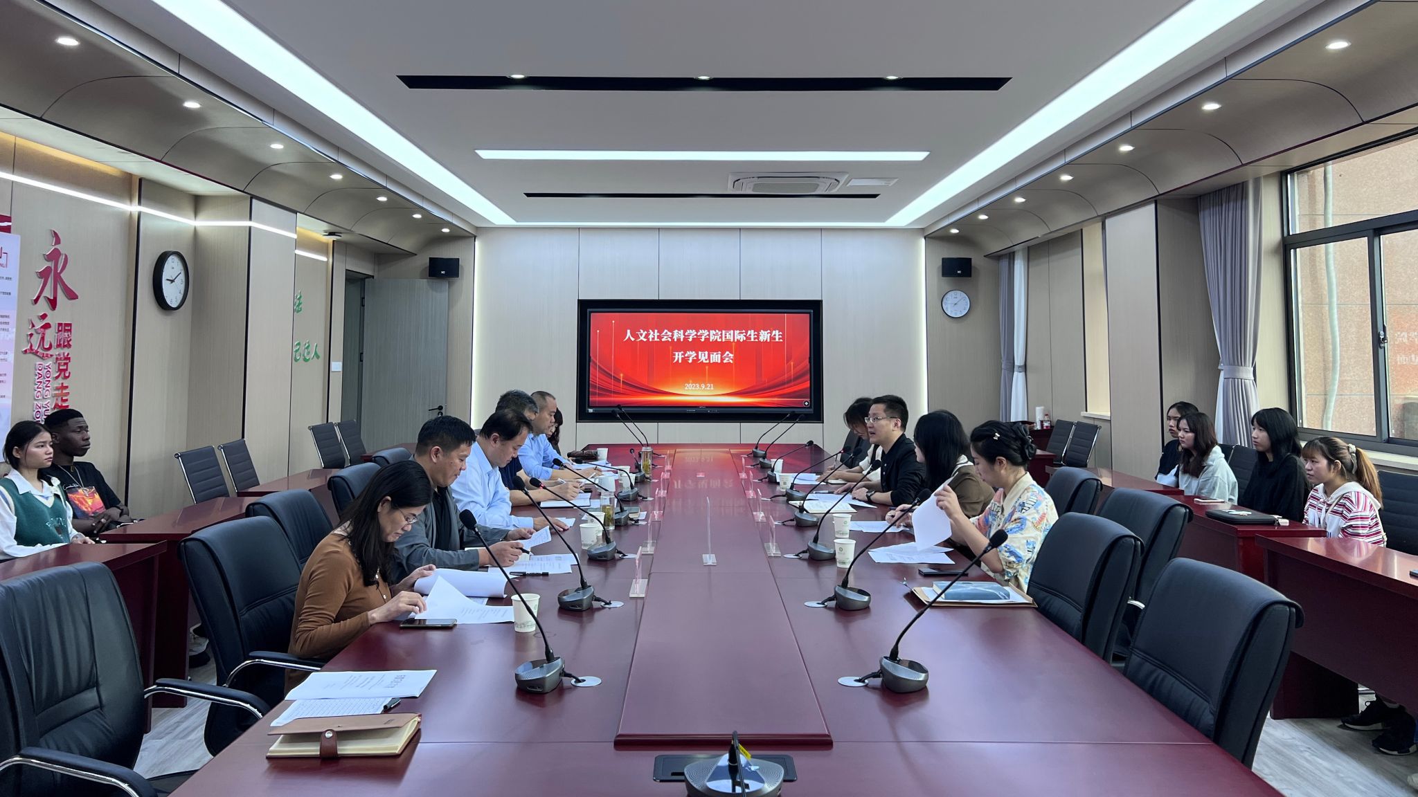 本网讯 9月21日上午,人文社会科学学院国际生新生开学见面会在人文楼204会议室举行。国际教育学院院长孙裴及国际生管理相关负责人,人文社会科学学院党委书记陈先玉、院长黄洪雷、副院长滕瀚、副院长单国雷,相关系负责人及国际生新生参加见面会。