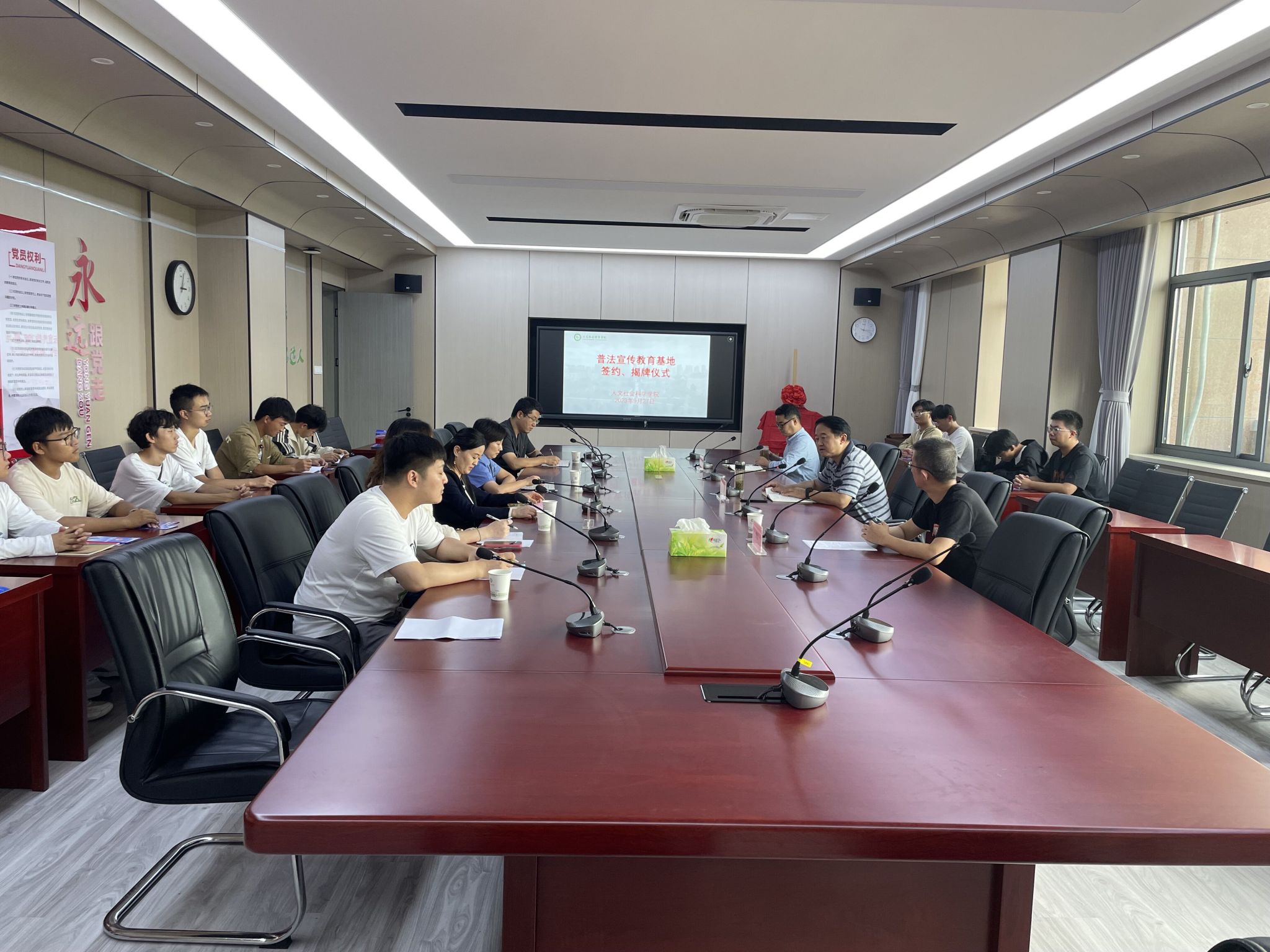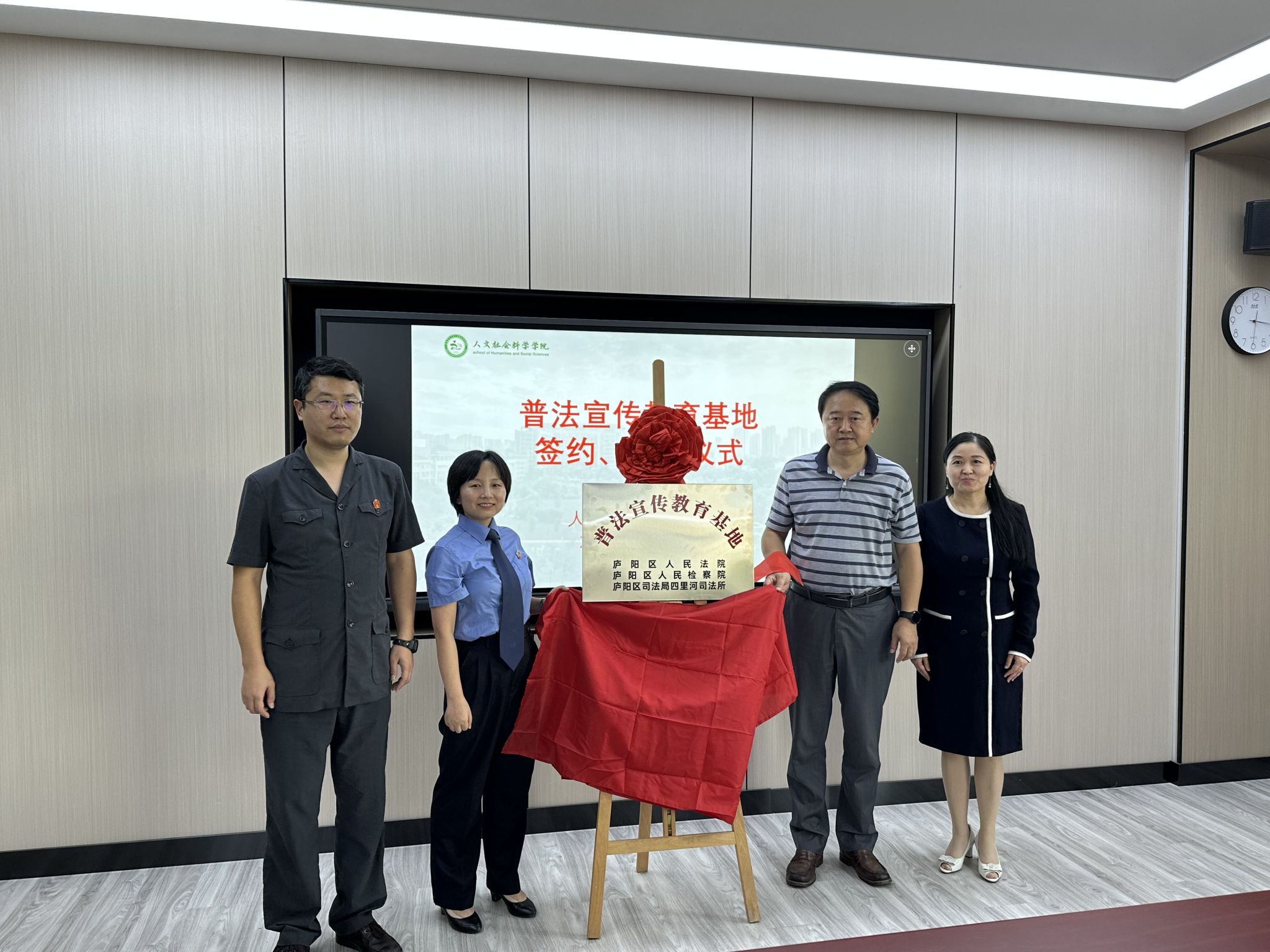 人文社会科学学院院长黄洪雷,学院党政办主任顾坚、法学系主任江晓华、庐阳区人民法院审管办主任王鹏、庐阳区人民检察院第一检察部主任赵婕、庐阳区司法局四里河司法所主任汪丽、副所长王卓妍以及法学系学生代表参加普法宣传教育基地签约、揭牌活动。