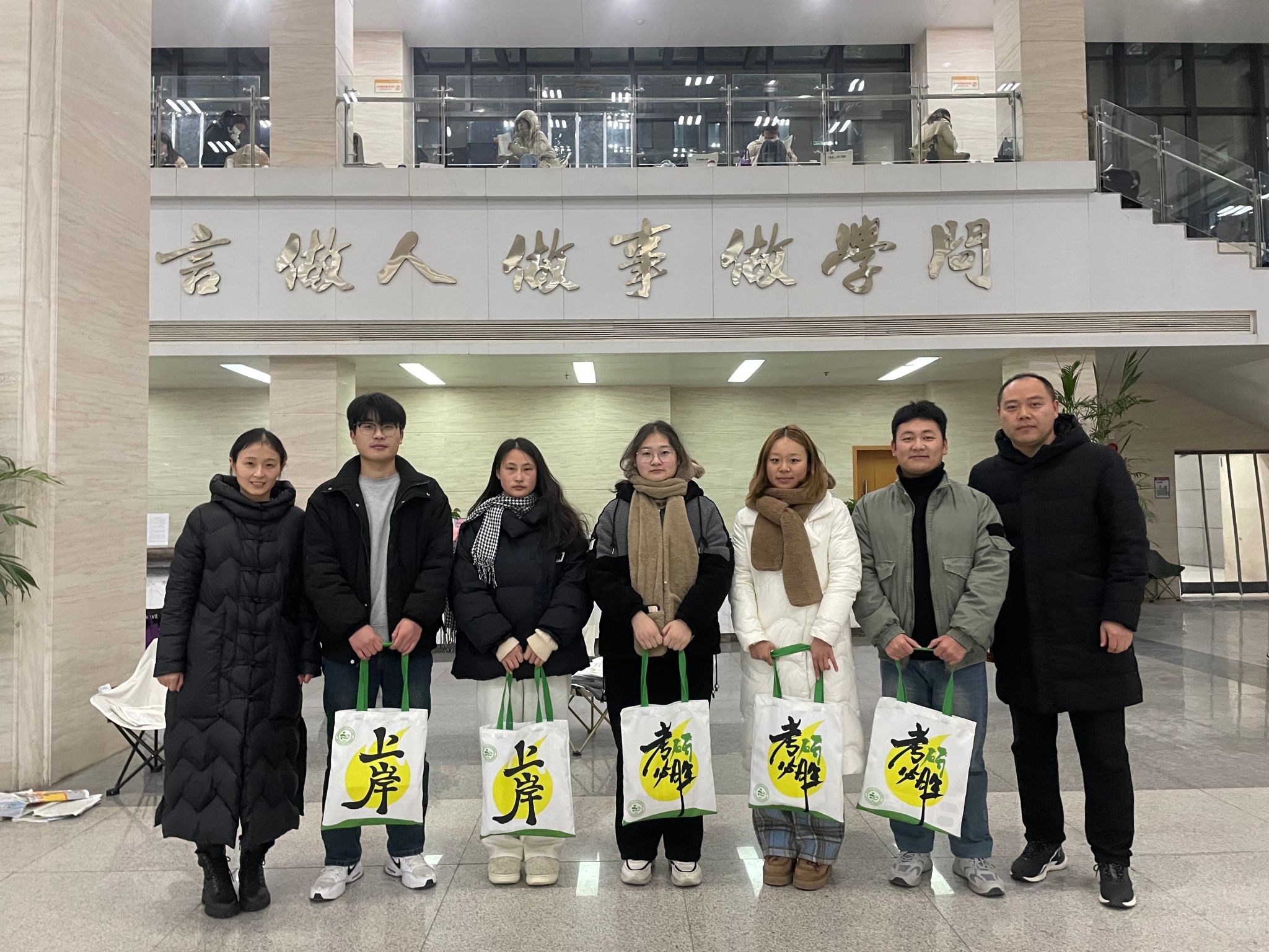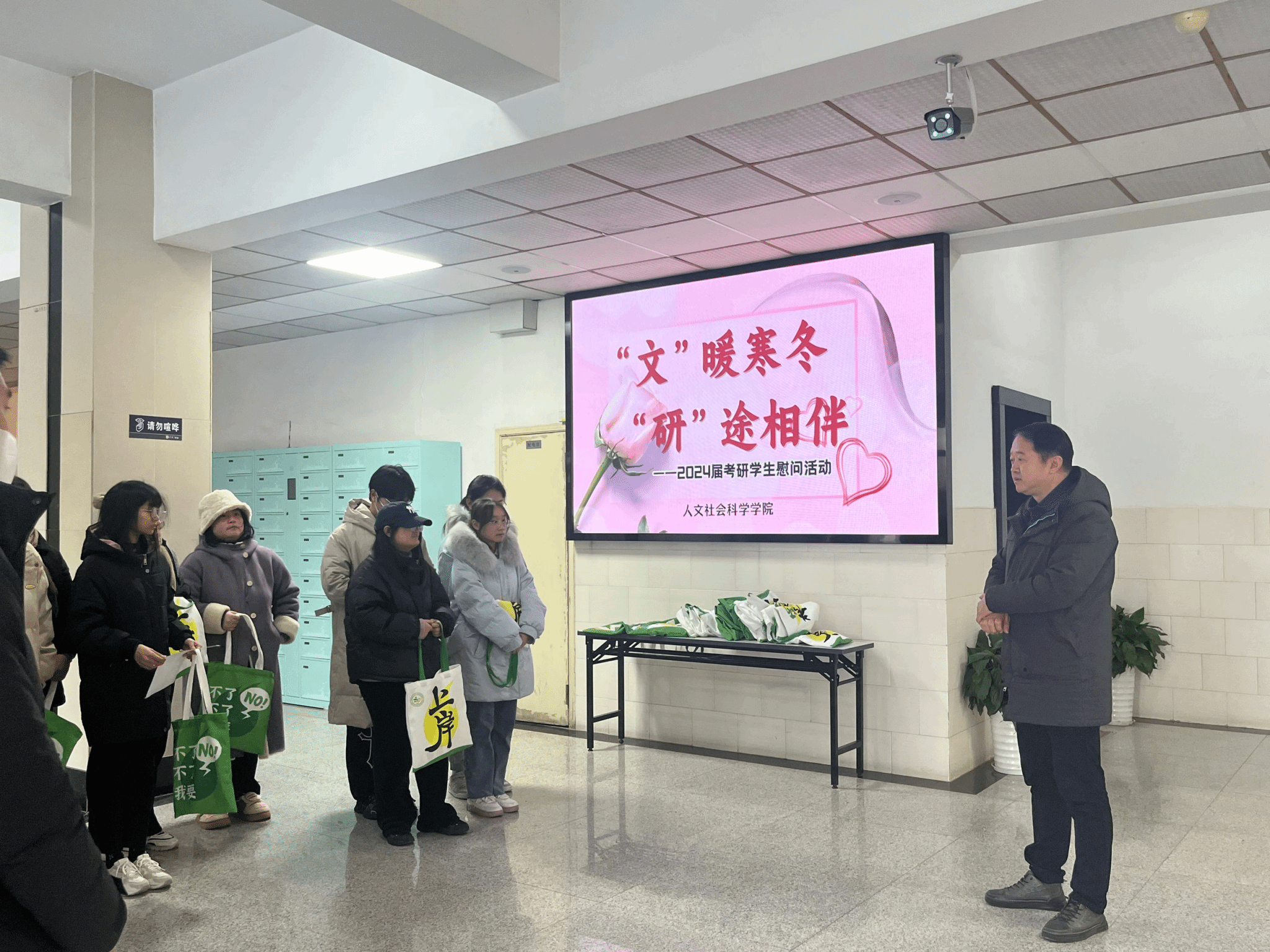 院长黄洪雷代表学院向积极备考的学子表示关心和慰问,勉励同学们要坚定信念、树立信心、调整心态、全力以赴、一战成硕。老师与同学们亲切交流,详细询问同学们的学习生活,温馨提醒同学们天气寒冷、注意保暖、劳逸结合,祝愿同学们都能取得理想的成绩,开启人生新篇章。随后,学院领导深入图书馆、宿舍向考研学子发放考研大礼包,礼包中每一份礼物都代表了一份期待,印有学院字样的礼品袋,寄托着学院对考研学生的关心与祝福;一份文具祝愿考研学子在考场泼墨挥洒,取得优异成绩;一个暖手宝,“暖身更暖心”希望考研学生乘风破浪,一战上岸。