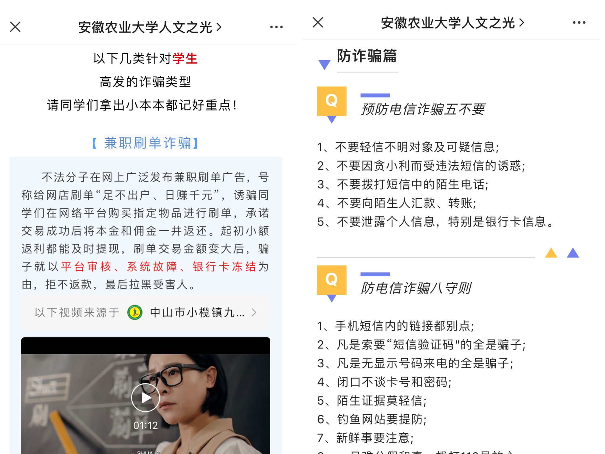 开展金融知识普及宣传教育。学院通过官方微信公众号平台,发挥网络育人功能,用正反两方面案例,引导学生理性消费,珍视个人信用记录,防范网络诈骗,远离不良“校园贷”“互联网消费贷”及其他非法借贷,帮助学生树立正确的消费观、荣辱观和价值观。