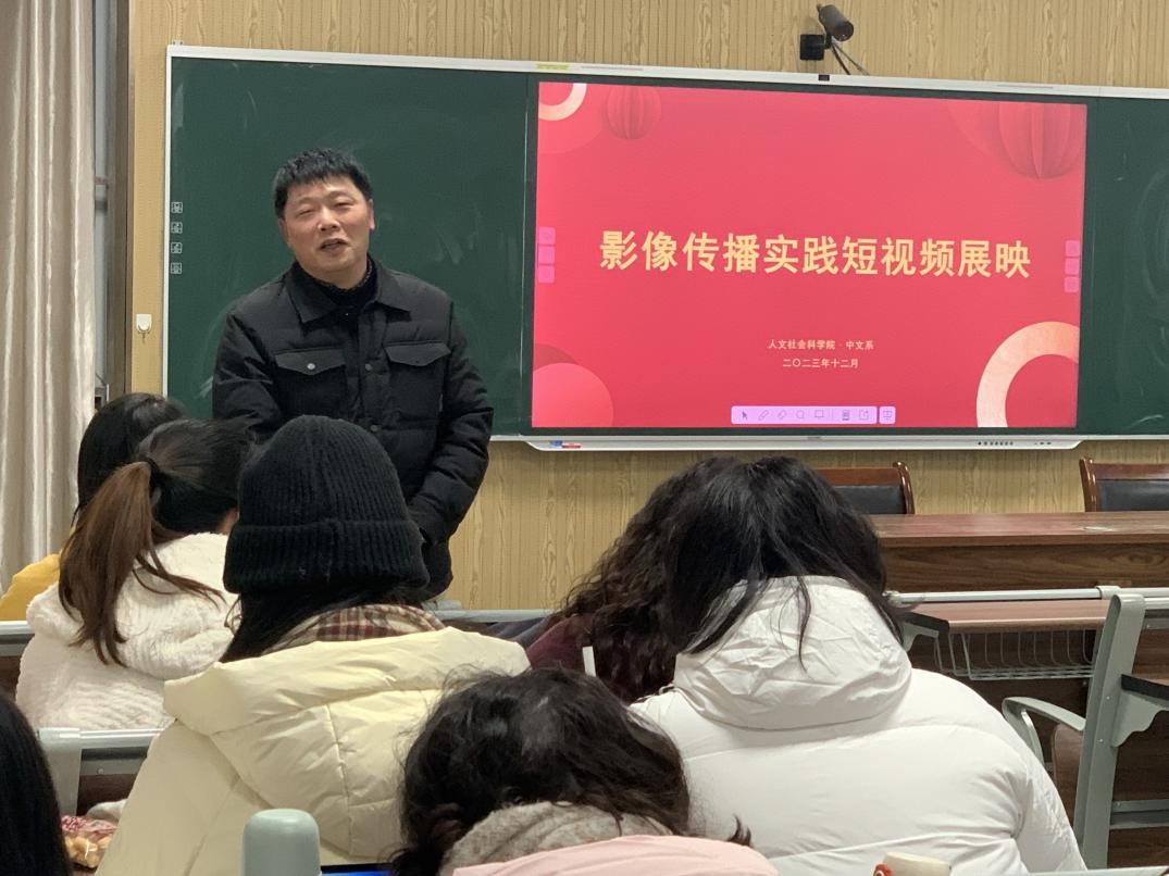 本网讯 12月22日,2021级汉语言文学专业学生在人文楼202教室举办影像传播实践课程短视频展映活动。人文社会科学学院党委书记王冬平、副书记单国雷、中文系汪方华教授等出席并参加了此次活动。