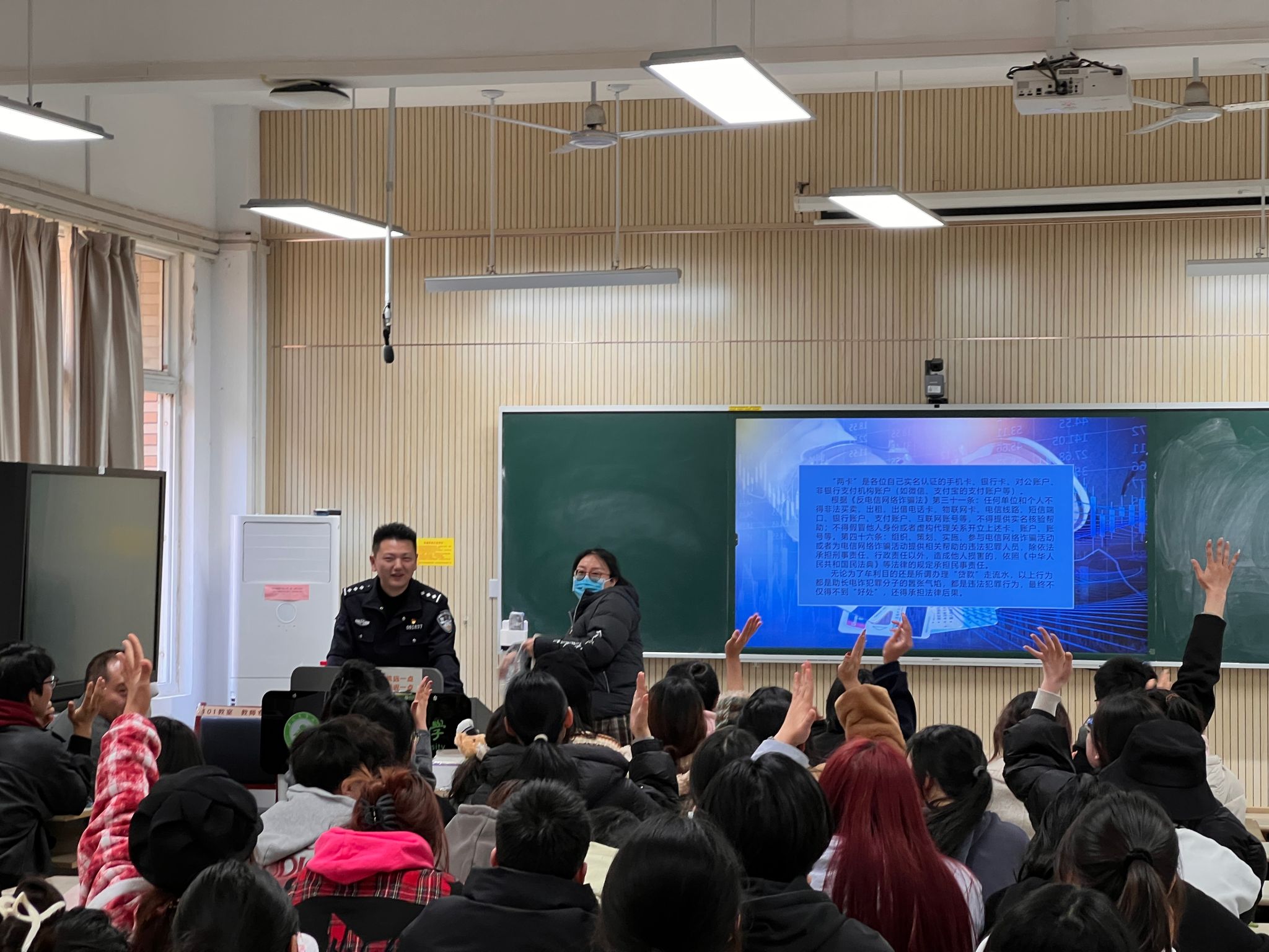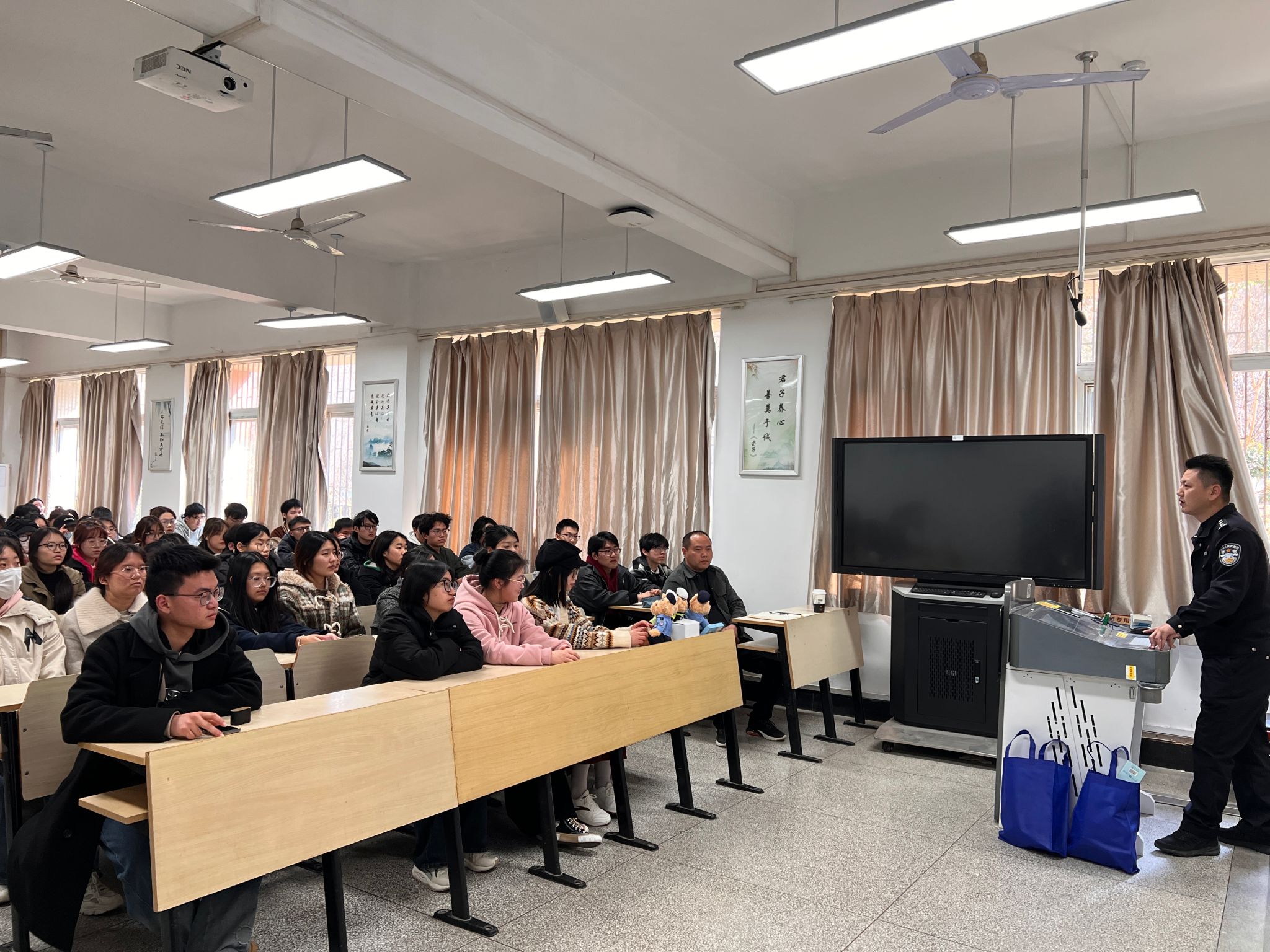 杨子吉从什么是电信诈骗、电信诈骗常用手段、如何防范电信诈骗三个方面切入,并结合大量详实的案例和数据,讲述了电信诈骗的多样性及破案的难度。详细介绍了冒充电商物流客服诈骗,冒充领导、熟人诈骗,虚假购物、服务类诈骗,刷单返利诈骗,网络游戏产品虚假交易诈骗,贷款、代办银行卡诈骗等多种诈骗类型,展示了每种诈骗手段的运行模式,防范诈骗手段的可操作方法,重点提醒同学们要善于分辨信息的真伪,看清电信诈骗的伎俩,增强预防电信诈骗意识。讲座现场,杨队长与现场学生进行问答互动,耐心解答大学生在日常生活中遇到的诈骗问题,并给予了建议和指导。
