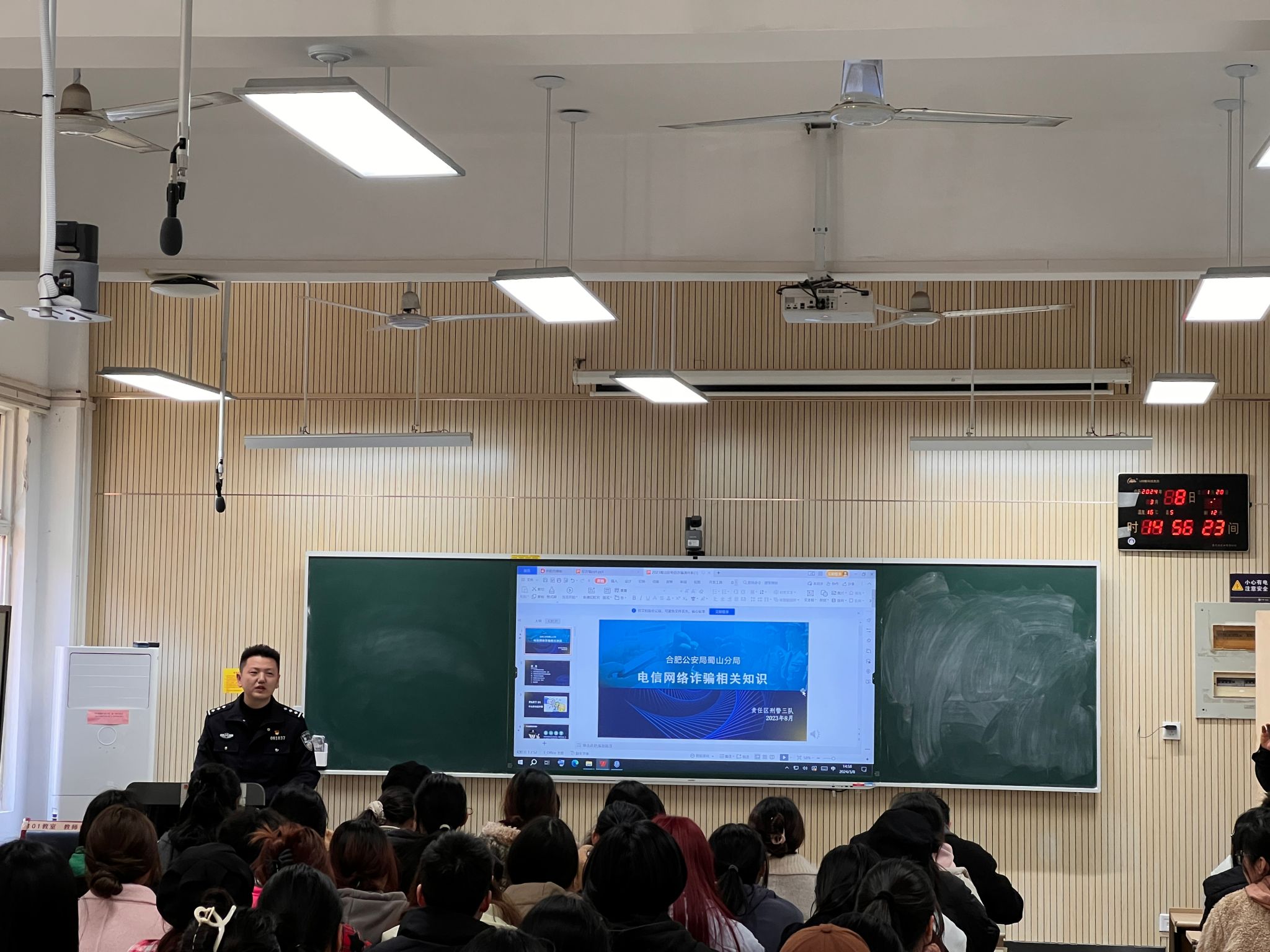 本网讯 3月8日下午,人文社会科学学院联合合肥市公安局蜀山分局琥珀派出所举行防范电信网络诈骗专题知识讲座,邀请合肥市公安局蜀山分局刑警三队杨子吉副队长主讲。琥珀派出所、校保卫处等单位负责人以及学院部分师生共计150余人参会,讲座由学院党委副书记单国雷主持。