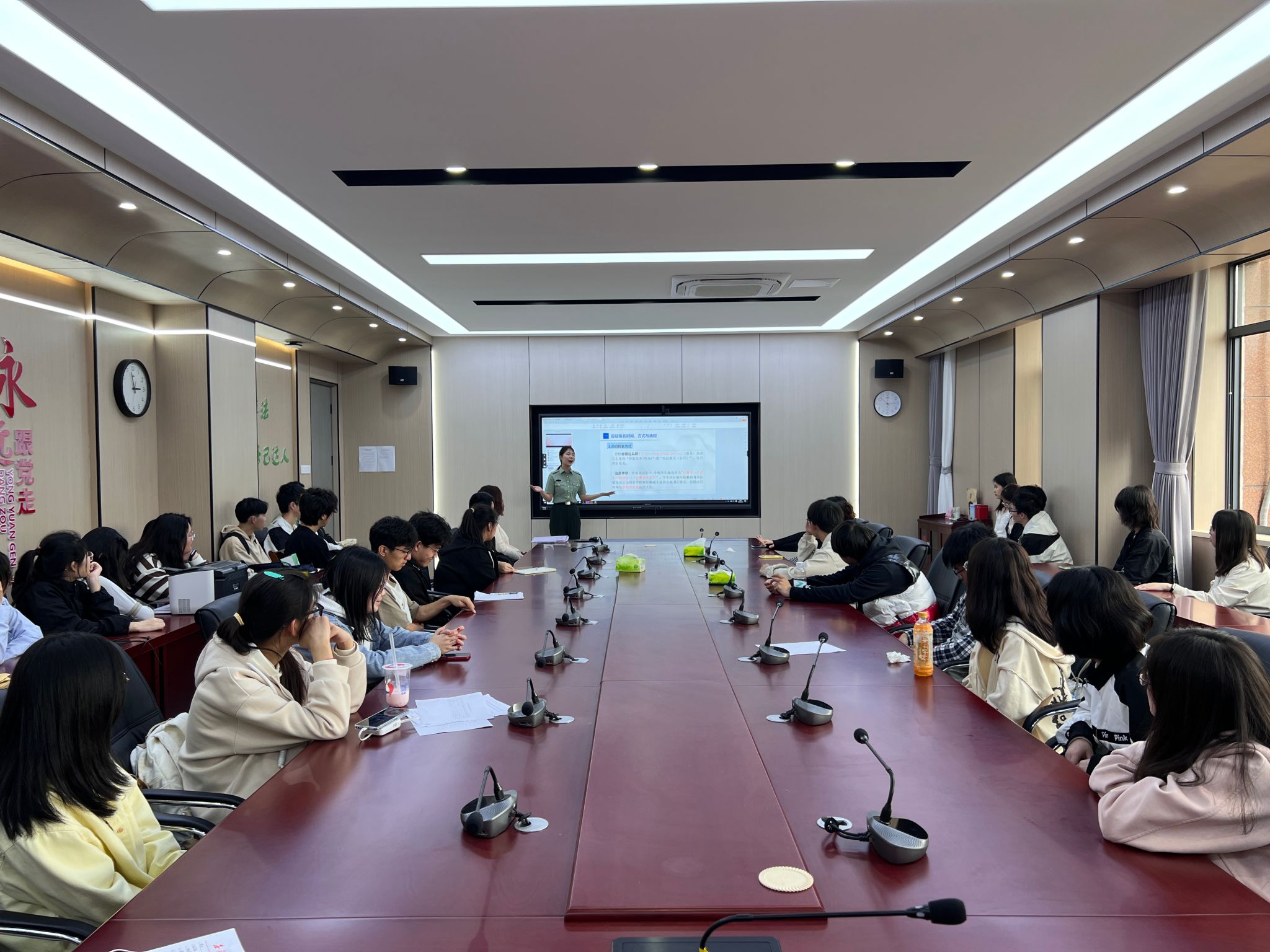 程家俊结合自身入伍经历,通过图片和视频详细介绍了在军队中的两年服役经历,回味难忘故事,分享成长体验。在训练中,他刻苦认真,努力学习技术;在生活中,他与战友们共同炊事、聊天谈心,收获了多种不同的人生体验。范婧琳向同学们详细解读了我校2024年征兵入伍政策,介绍了大学生应征入伍报名要求,鼓励在场的同学们要主动响应祖国号召,积极报名参军入伍,让青春在祖国和人民最需要的地方绽放绚丽之花。