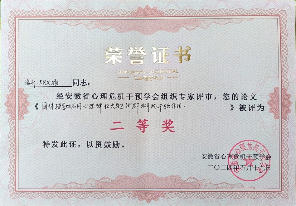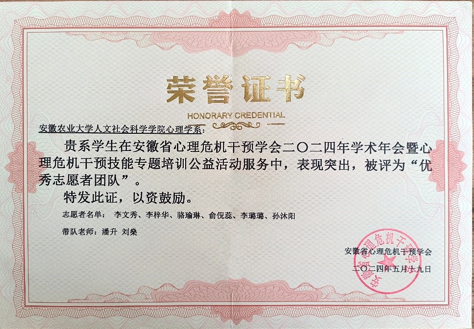 本网讯 5月18日至19日,安徽省心理危机干预学会2024学术年会暨心理危机干预技能专题培训在合肥举行,会议主题为“加强心理危机干预培训,提升心理干预专业水平”,来自省内各高校、中小学心理健康工作者、青少年心理健康工作以及医疗、公安司法相关机构人员180多人参加会议。我院实验中心教师潘升提交了会议论文并获奖,我院心理学系六位本科生参会并开展了志愿服务工作。