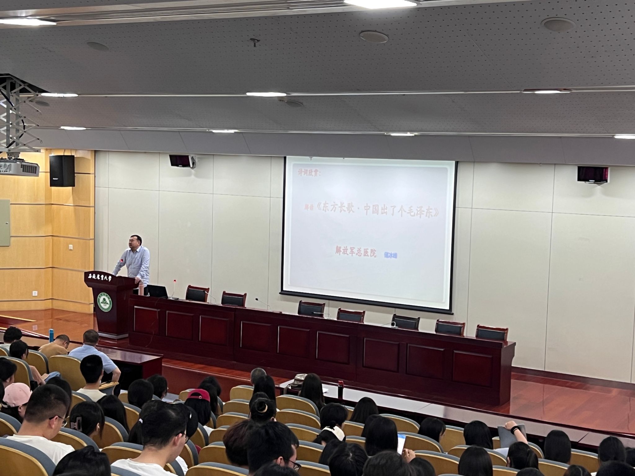 储冰峰教授以时间为经、以史实为纬,通过对长诗《东方长歌——中国出了个毛泽东》中“文氏偈语”“板仓绝恋”“人间正道”“人民万岁”四个重要篇章的解读,让师生们跟随毛泽东一生的重要经历,了解毛泽东心怀天下的格局、敢为人先的气度、上下求索的风骨、英明决断的智慧、力主沉浮的豪迈。重温了党的伟大事业成长发展壮大历程。
