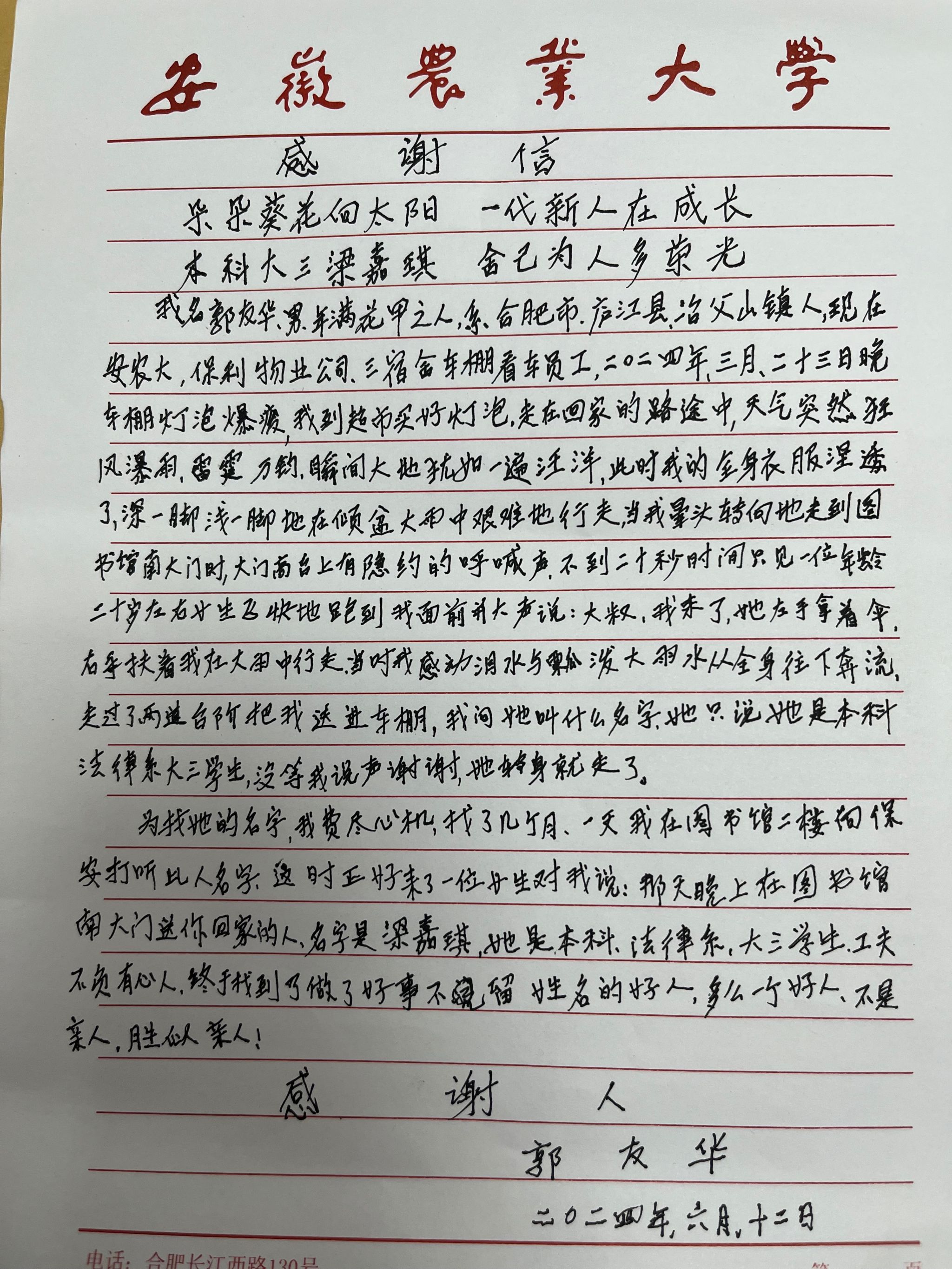 人文社会科学学院学生热心助人收到感谢信 日期:2024年06月13日 18:32 作者: 点击: 本网讯:2024年6月13日,学校物业公司员工郭友华送来感谢信,对我院2021级法学专业梁佳琦乐于助人事迹表示感谢。信中表示,2024年3月23日晚上,郭友华外出买灯泡,天气骤变突降暴雨,全身湿透,路过学校图书馆时,梁佳琦同学主动为其撑伞护送其到工作地点。梁佳琦将雷锋精神内化于心、外化于行,用实际行动践行社会主义核心价值观,展现了新时代青年的责任与担当。(图文/邓紫艳 编辑/张智勇 预审/黄伟 审核/单国雷) 上一条:党建引领学科发展——中国语言文学学科举办首期学术沙龙 下一条:人文社会科学学院召开学情座谈会