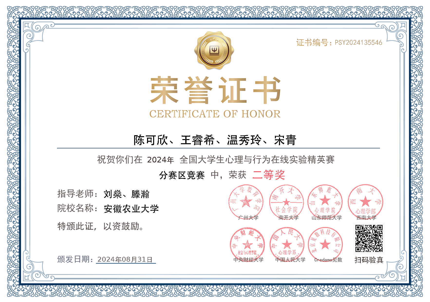 本网讯 2024年7月28日至8月31日,由全国大学生心理与行为在线实验精英赛赛事联盟主办的第二届全国大学生心理与行为在线实验精英赛分赛区竞赛顺利举行,来自全国各高校的933支队伍参赛。经过校赛层层选拔,由我院心理学系本科生陈可欣任组长的队伍顺利晋级东部赛区竞赛、荣获东部赛区二等奖。
