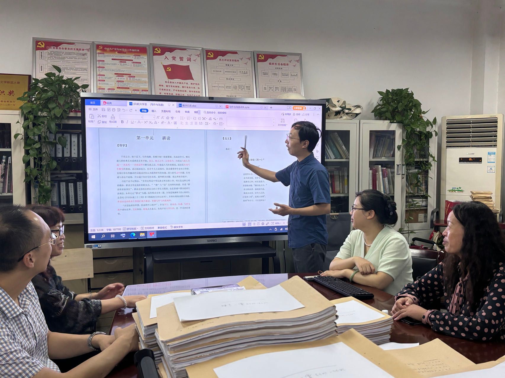 王雪松老师为大家进行了说课演示,结合篇目选读、问题设计、学生互动等环节向大家介绍了自己思考和设计,并与在座各位老师就大家关心的问题做充分讨论。通过集体备课,课程组老师对《写作和沟通》有了更加明晰深入认识,为授课奠定了良好基础。