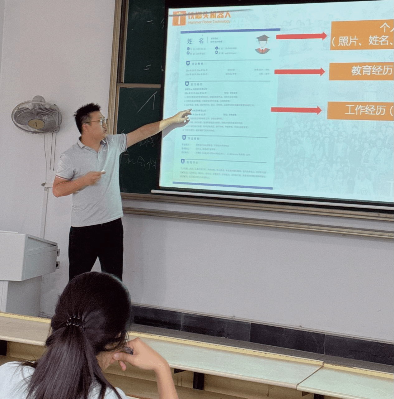 本网讯 为进一步推进2025届毕业生就业工作,提升毕业生简历制作质量和求职面试技巧,9月27日,学院邀请铁榔头教育科技有限公司招聘主管王健进在人文楼606教室为2025届毕业生作简历制作专题讲座。