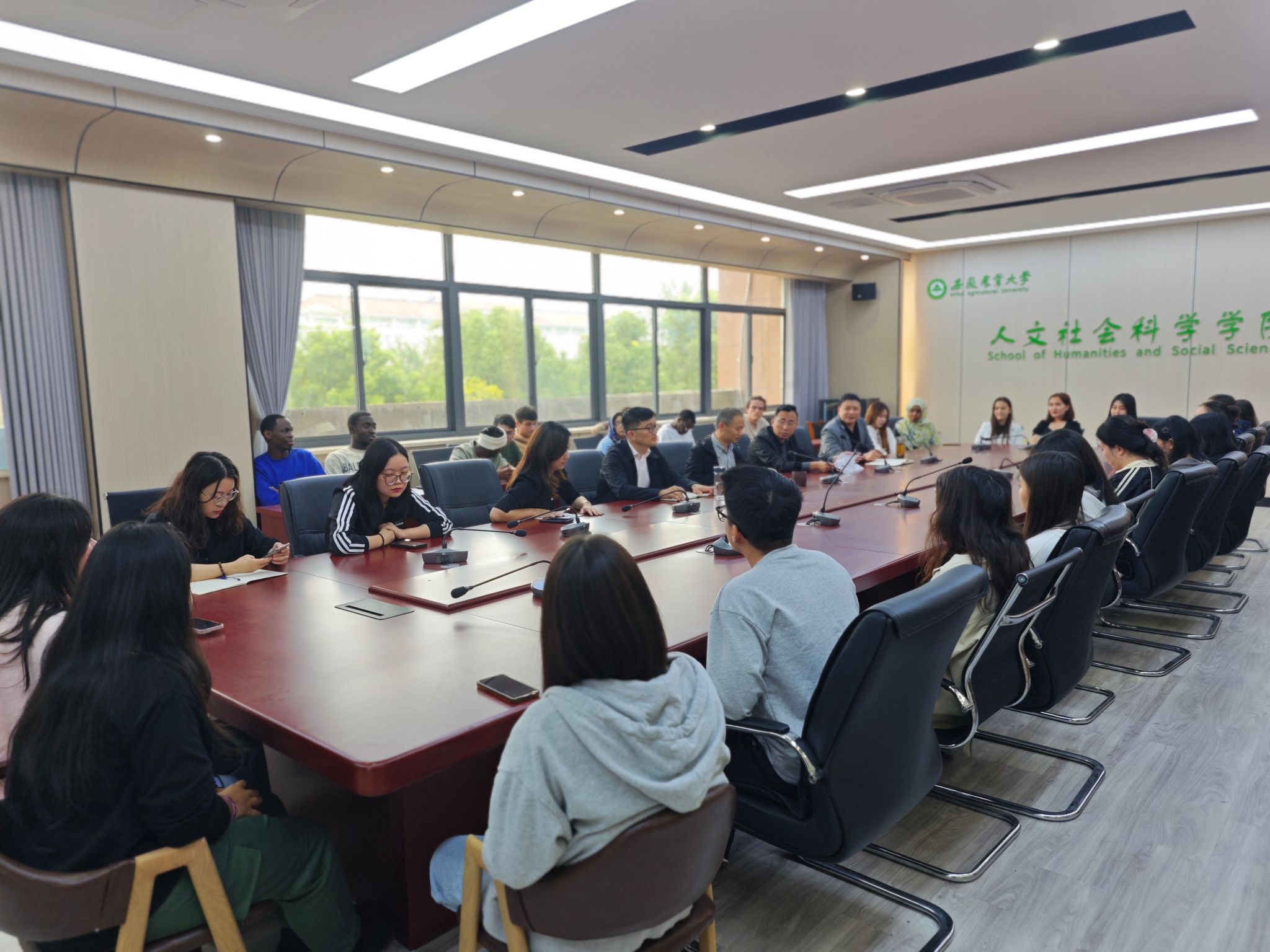 本网讯 10月10日下午,人文社会科学学院来华留学生见面会在人文楼206会议室举行。人文社会科学学院党委书记王冬平、院长方国武、党委副书记孙辉、副院长滕瀚、中文系主任张艺,系部相关负责人以及2024级来华留学生参加。